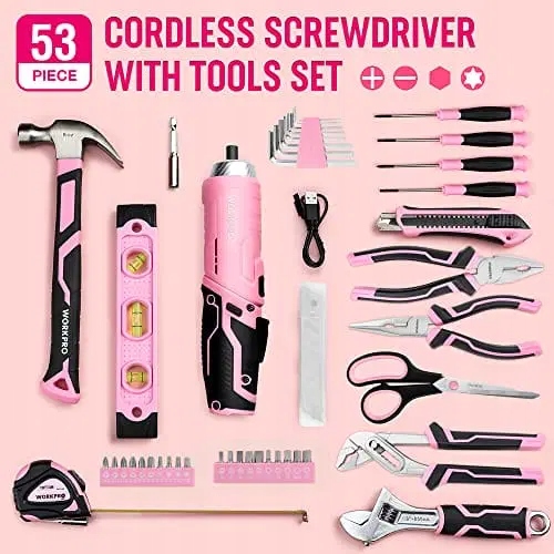 Рожевий набір інструментів WORKPRO з 53 предметів і викруткою