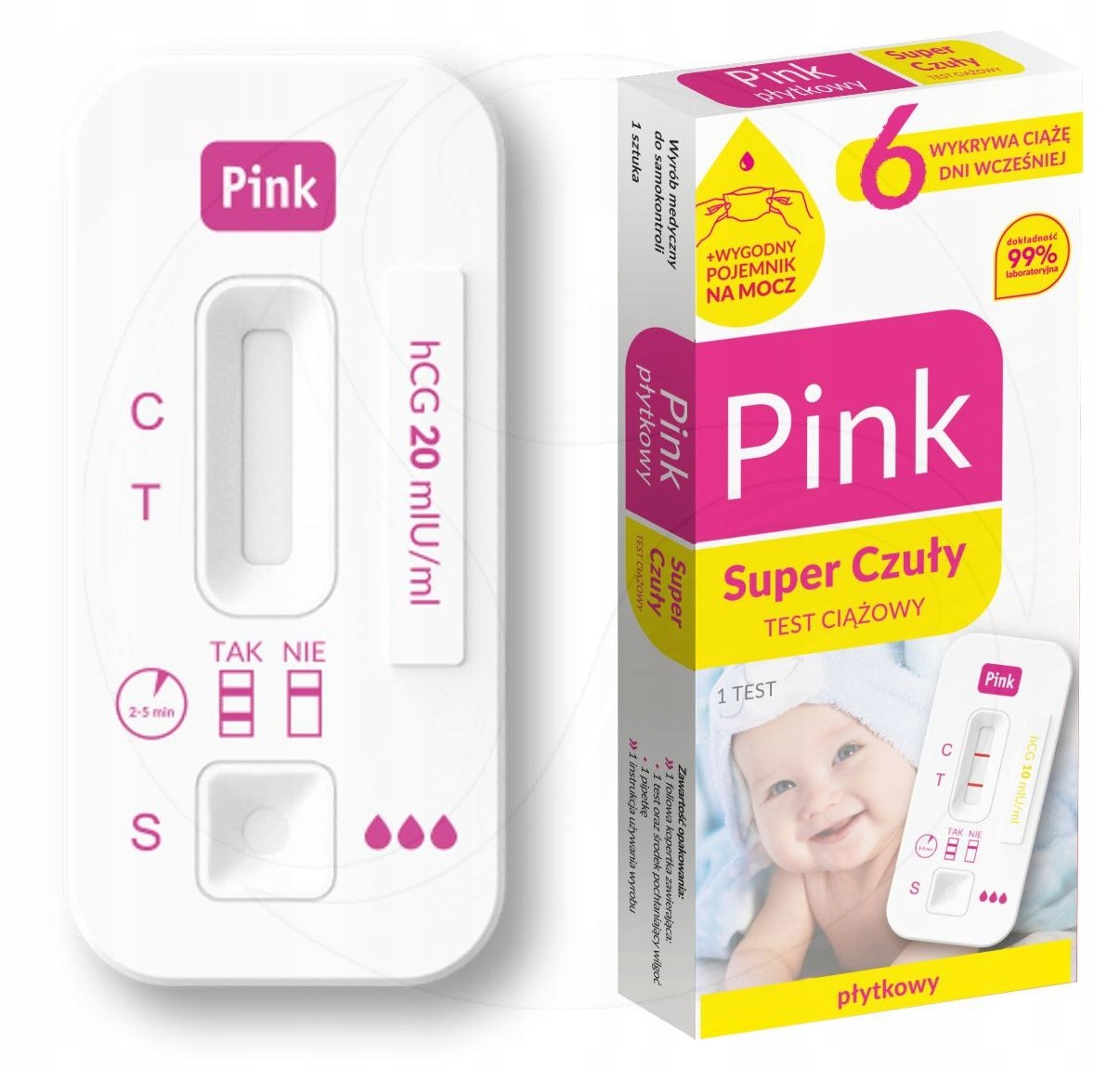 PINK Test Super Sensitive – чрезвычайно удобный в использовании планшетный тест на беременность, отличающийся высокой точностью диагностики. Он определяет содержание в моче гормона ХГЧ (хорионического гонадотропина человека), который вырабатывается у беременных. Чувствительность теста составляет 10 млЕд/мл, а точность - по данным клинических исследований - более 99,9%.