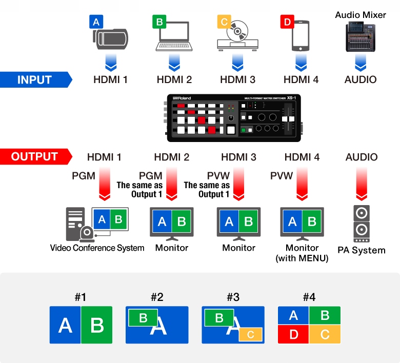 Устройство имеет скалер разрешения на каждом из 4-х входов HDMI, работу в формате 4:4:/10-бит и возможность загрузки графики через USB-порт. Roland XS-1HD — идеальное устройство для использования на концертах, театральных и церковных мероприятиях. Он идеально подходит для видеоконференций и деловых встреч. В режиме Split к выходному изображению можно применить до 3 слоев, устройство имеет целых 4 выхода, которые можно свободно настроить в матричном режиме. XS-1HD принимает изображения с любого устройства с выходом HDMI, независимо от того, смартфон ли это, компьютер или камера, и обеспечивает удобное масштабирование вверх и вниз. Пользователи смогут удобно обрезать изображение на выходе устройства. Для облегчения работы Roland XS-1HD оснащен системой памяти, позволяющей сохранять назначенные режимы работы, известные по ценным моделям V-1HD и SDI. Как и они, XS-1HD также имеет функции аудиомикшера с профессиональным аудиовходом и выходом.