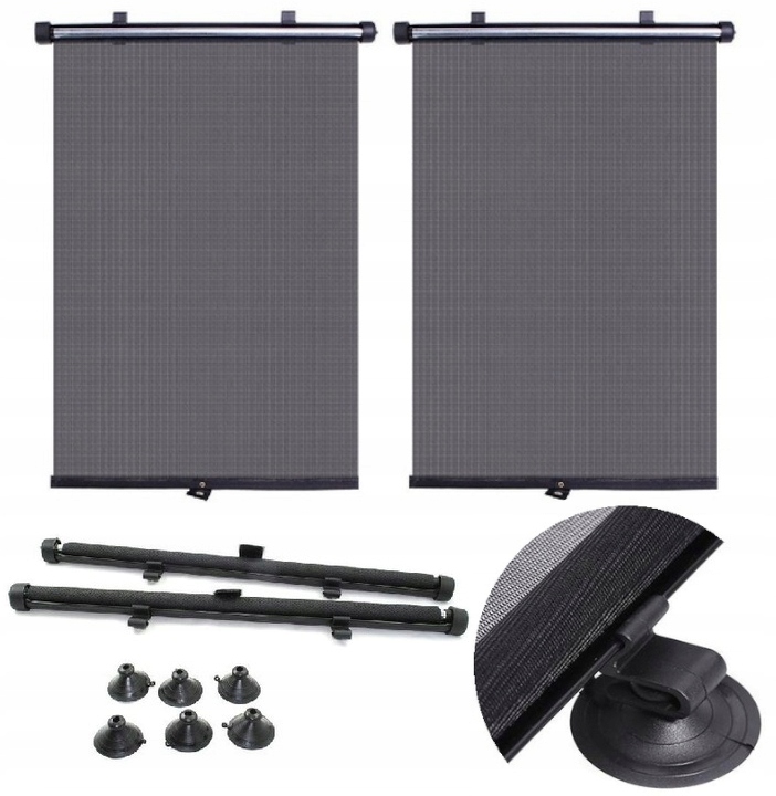 В комплект входят две рулонные шторы на боковые окна. Простой монтаж с помощью присосок (непосредственно на стекло) или зажим(над стеклом).