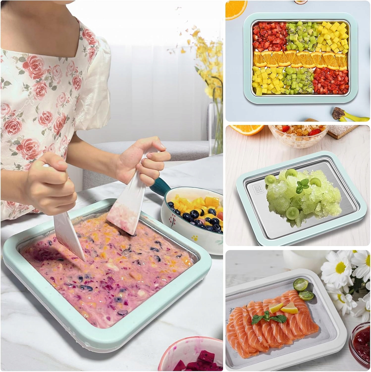 Рабочая поверхность изготовлена из высококачественной нержавеющей стали 304, устойчивой к коррозии и легко чистящейся. Двухслойная конструкция с экологическим хладагентом обеспечивает равномерное замерзание. В набор входят 2 лопаточки из безопасного полипропиленового материала, которые не царапают поверхность.