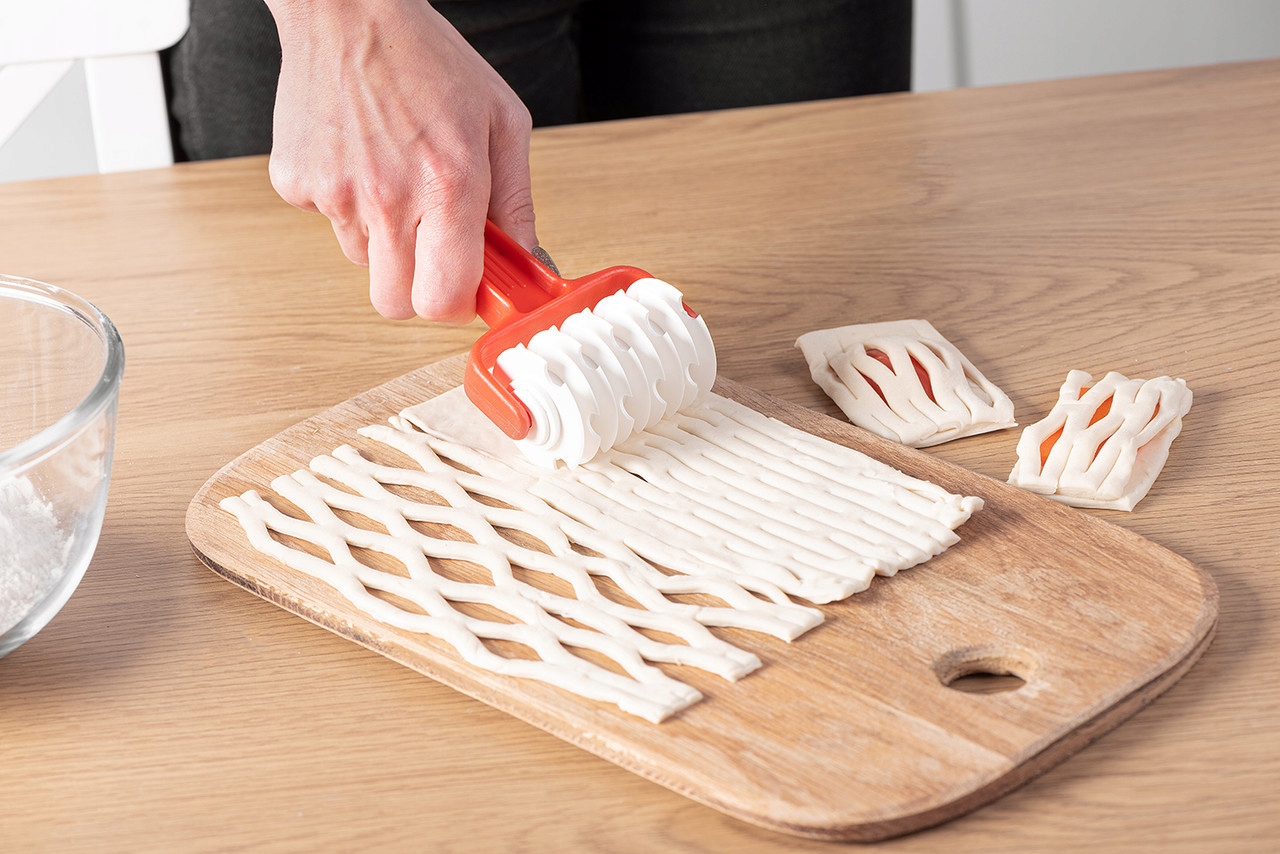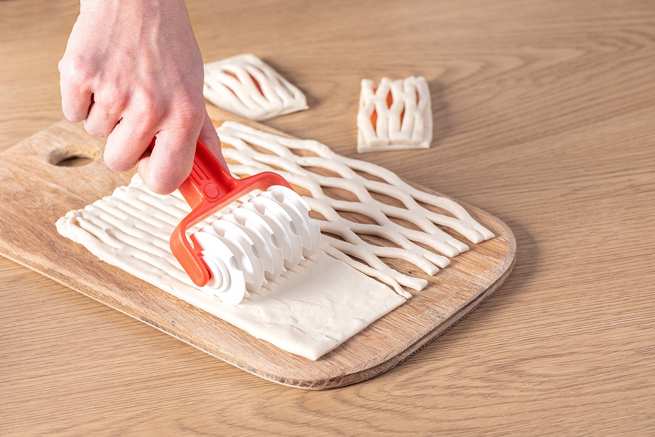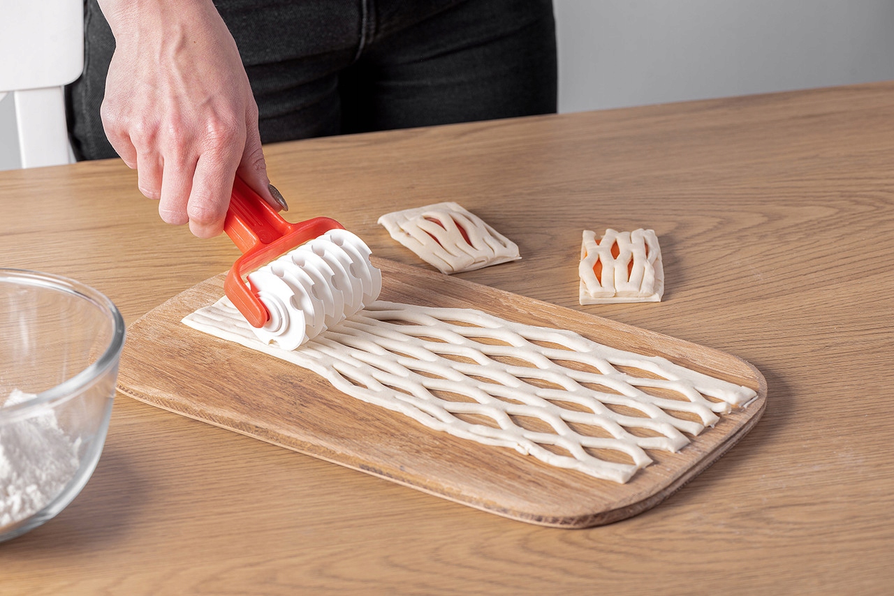 На одну полоску выложите начинку (джем, шпинат и т. д.), вторую полоску прокатайте скалкой, чтобы получились равномерные надрезы.
