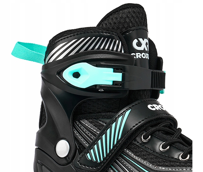 Шнурки, пряжка с зубчатым ремнем и защелка обеспечивают правильное затягивание и надежное удержание ноги в обуви, предотвращают смещение стопы и гарантируют безопасное вождение. Застежки на коньках Croxer имеют кнопку, которая предотвращает их расстегивание во время катания. Ремешок на липучке позволяет удерживать шнурки, предотвращая их случайное расстегивание.