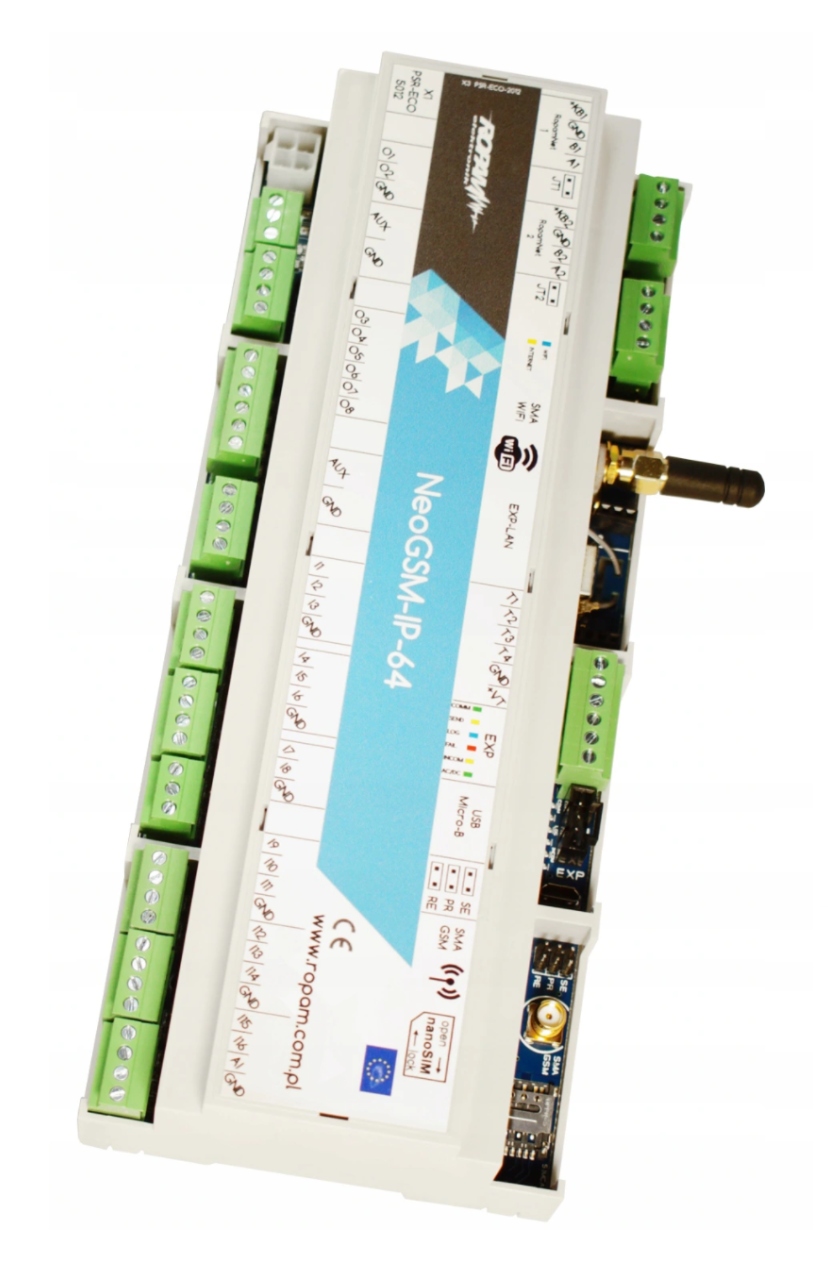 NeoGSM-IP-64-D12M — компактный четырехзонный ПКП, предназначенный для системы охранной сигнализации Ropam. Имеет встроенные модули Wi-Fi и GSM, которые позволяют осуществлять удаленное управление и контроль системы. Устройство идеально подходит для построения систем охранной сигнализации среднего размера с функциями домашней автоматизации в таких объектах, как дома, квартиры, магазины или малые предприятия. ПКП поддерживает 4 независимые зоны сигнализации, которые могут работать в двух режимах ожидания (полный или ночной). Устройство оснащено 16 программируемыми входами, к которым можно подключить любые типы извещателей. Он также имеет 8 выходов, благодаря которым мы можем подключать устройства домашней автоматизации к панели управления. Количество входов и выходов можно расширить до 64 входов и 40 выходов с помощью специальных расширителей. (EXP-I8, EXP-O8). NeoGSM-IP-64-D12M имеет 2 встроенные шины RopamNET, благодаря которым возможно расширение панели управления. с дополнительными устройствами для увеличения его функциональности. Пультом управления можно управлять удаленно с помощью приложения RopamNeo (Android/iOS). Устройство оснащено корпусом, допускающим монтаж на рейку DIN TH35 (шириной 12 модулей DIN). Панель управления NeoGSM-IP-64-D12M питается от источника постоянного тока 12 В.