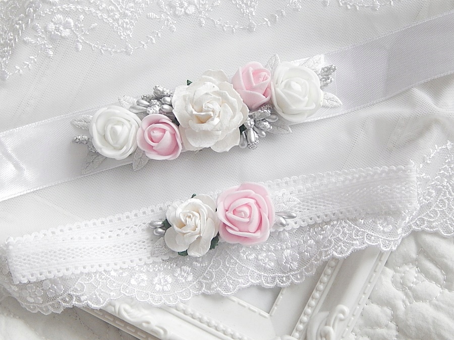 повязка на голову на декоративной белой эластичной, украшенной нежными цветами. Его схема в незаконном состоянии составляет около 36 см
