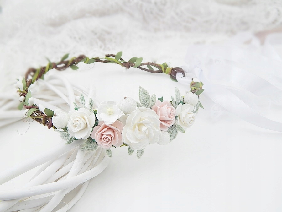 Уникальный венок, украшенный нежными белыми розовыми розами с добавлением зеленых ветвей. Wianus Регулировал окружность прибл. Sajmonart