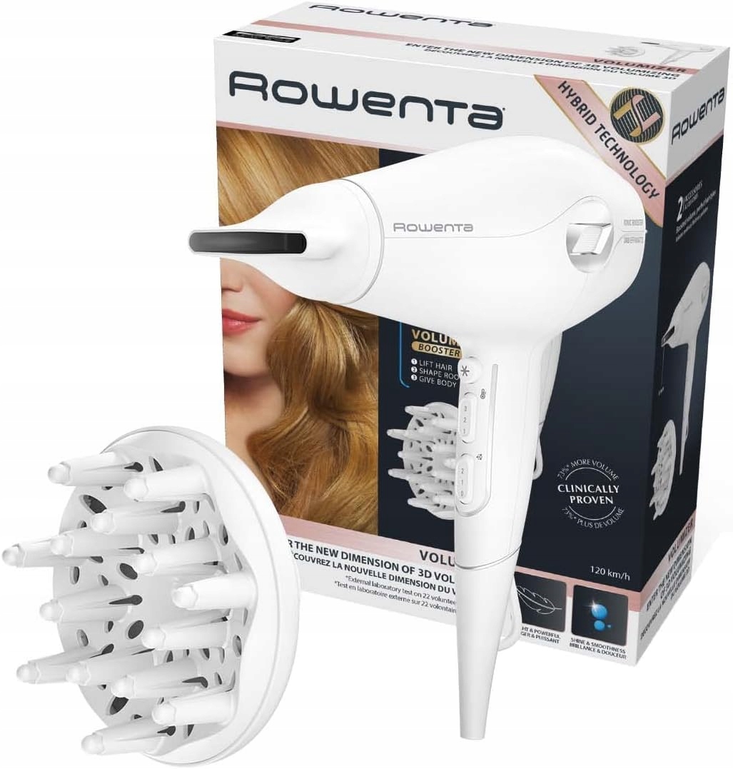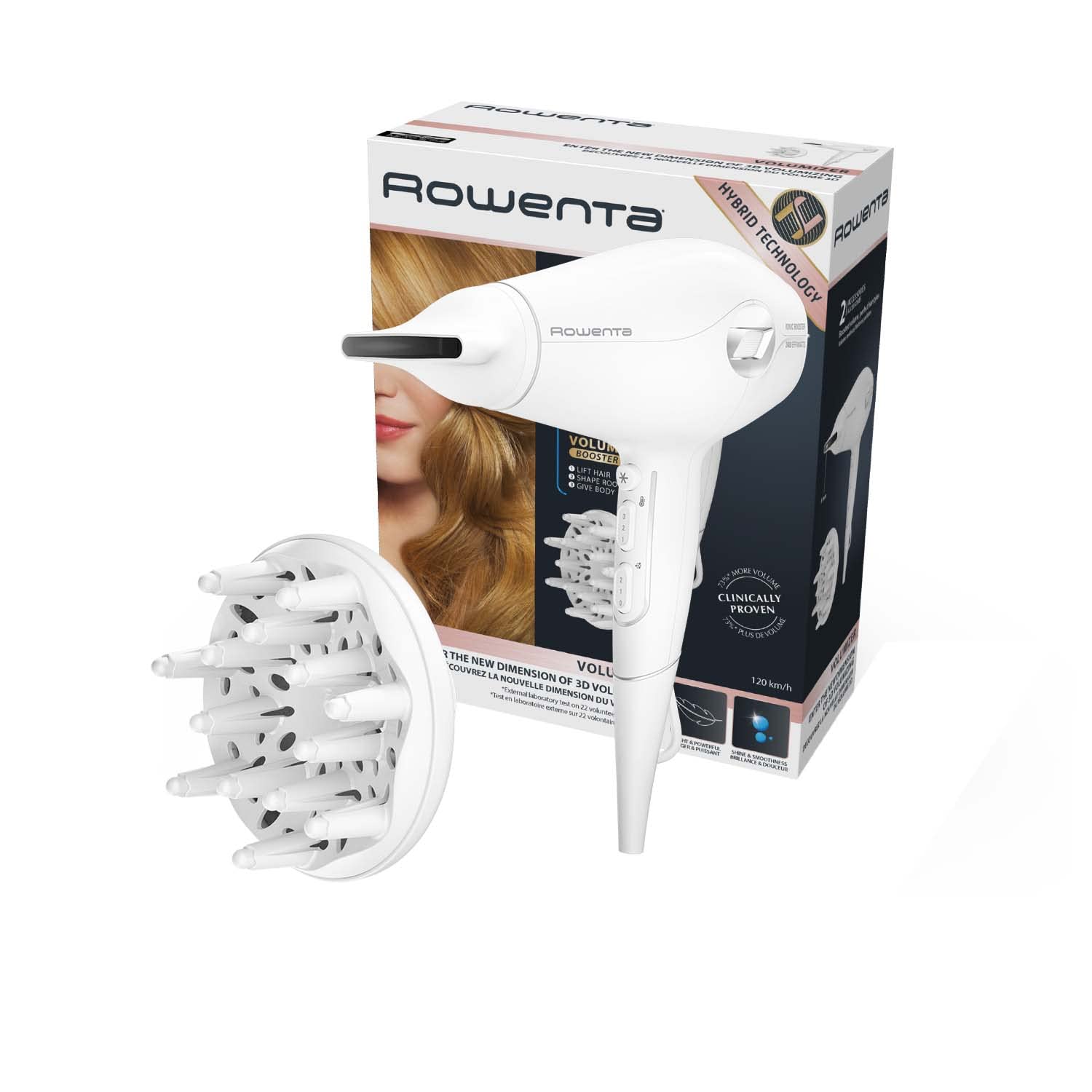 Название модели: Rowent Volumizer CV6130 - Прочная сушилка 2400 Вт, сопло и диффузор воздуха, 3 скорости и 3 температуры, 3D -усилитель объема, кнопка холодного воздуха, белый и серебряный показ больше