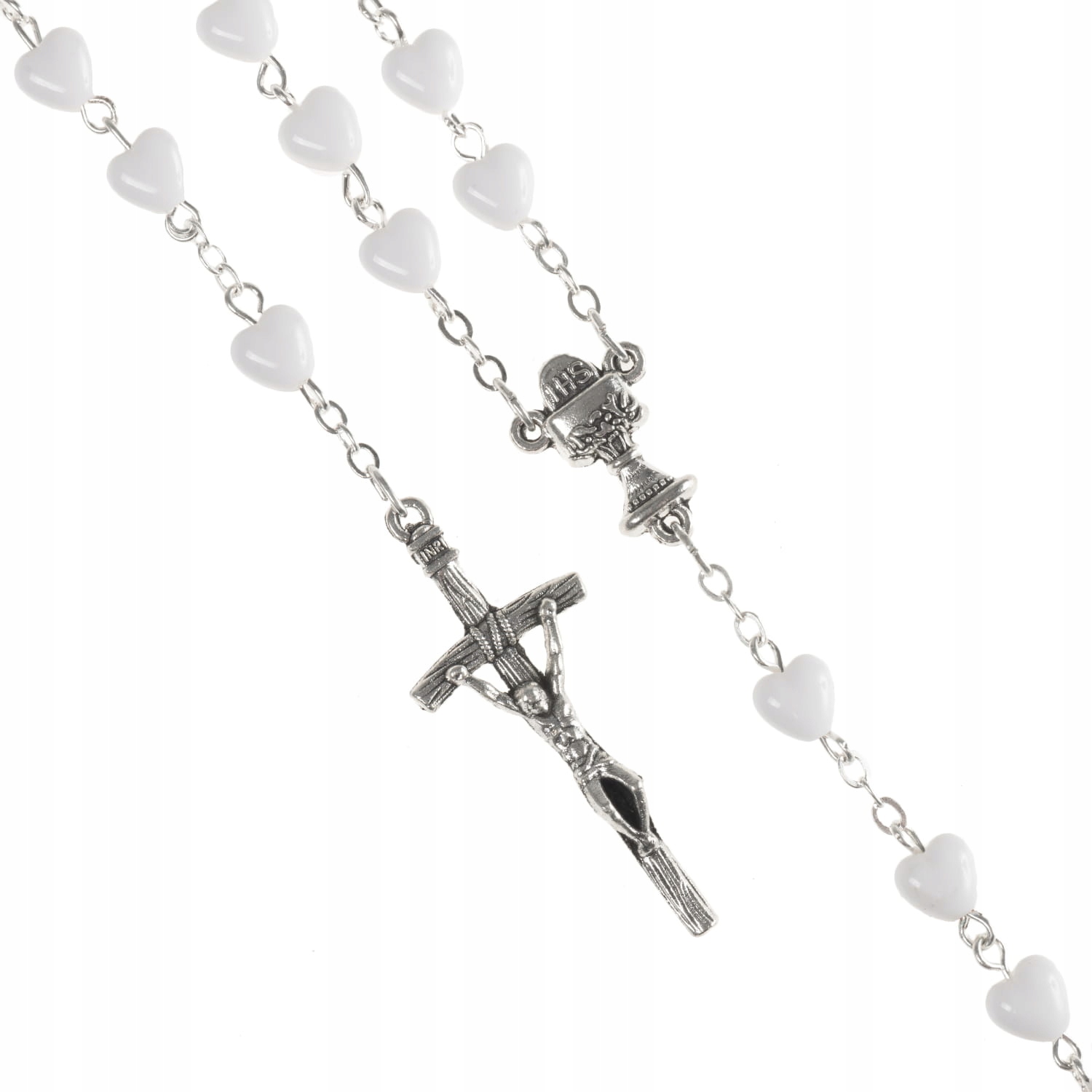 Меловые бусины в форме белоснежных сердечек с крестом Св. Иоанн Павел II. Этот набор станет не только прекрасным подарком к Первому Святому Причастию, но и инструментом для красивой детской молитвы.