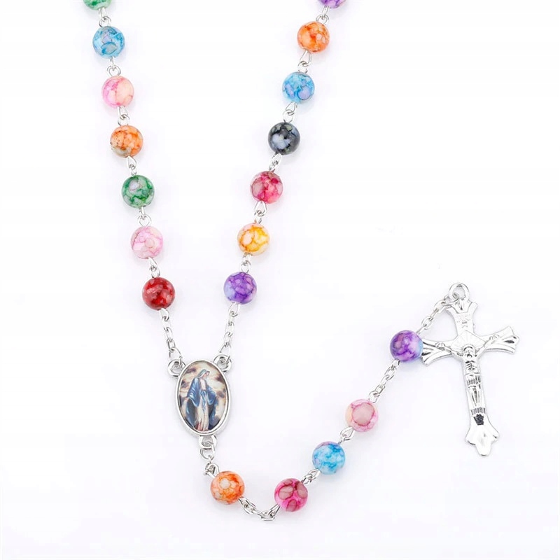 Красивые четки, ожерелье с серебряным крестом и медалью с изображением Лурдской Богоматери.