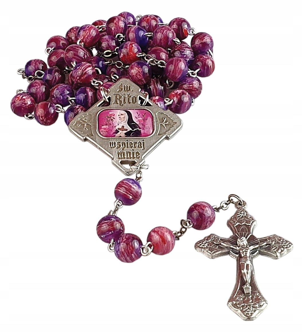 Четки, приготовленные для поклоняющихся св. Рита, покровительница самых сложных дел. Украшением этих красивых четок является специально разработанный и отчеканенный соединитель. Рядом с изображением Святого и молитвенной надписью расположены частицы лепестков роз, освященных во время традиционного богослужения в честь Святого, совершаемого каждый 22-й день месяца в церкви Св. Екатерины в Кракове. Каждые четки упакованы в удобный джутовый футляр.