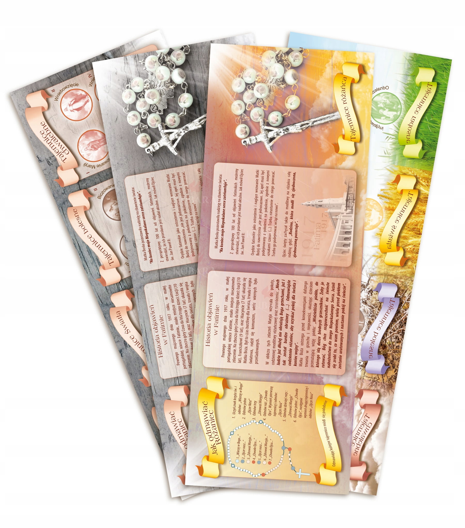 Четки в виде сложенной книги содержат историю явлений Пресвятой Девы Марии в Фатиме и инструкции о том, как молиться четками. Красивые, вырезанные сцены, изображающие радостные, светлые, болезненные и славные тайны, позволяют активно создавать четки. Кроме того, в книге представлены две очень важные фигуры - Святой Иоанн Павел II и кардинал Стефан Вышинский.