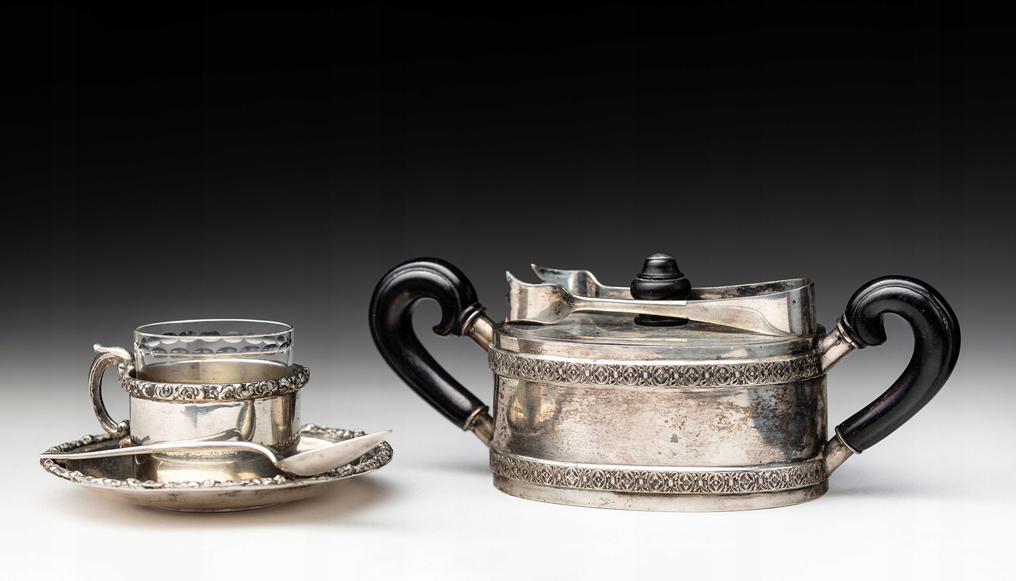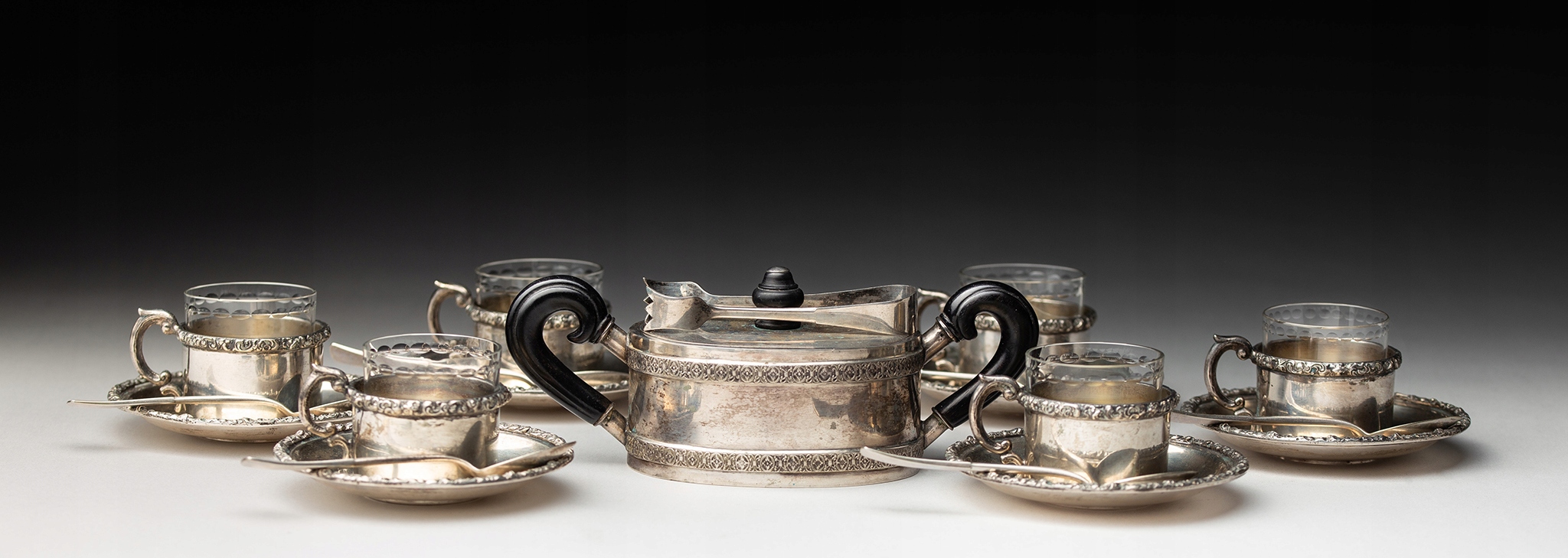 Чрезвычайно декоративный кофейный сервиз, полностью выполненный из серебра 800 пробы.Набор состоит из овального серебряного подноса, украшенного растительным орнаментом, шести серебряных блюдец, шести серебряных корзин для чашек, шести стеклянных вставок, серебряной сахарницы. миска, шесть серебряных ложек и серебряные щипцы для кубиков сахара. Корзины и блюдца украшены растительным орнаментом, а также украшены ручками. Вставки выполнены из бесцветного стекла с полированной розеткой внизу и полированным декором по верхнему краю. Тулово украшено двумя полосами с розеточным орнаментом, боковые ручки и верхняя ручка выполнены из черненого дерева. Ложки кофейные, гладкие, с лопаточной ручкой. Щипцы для кубиков сахара с характерным трехгранным наконечником.