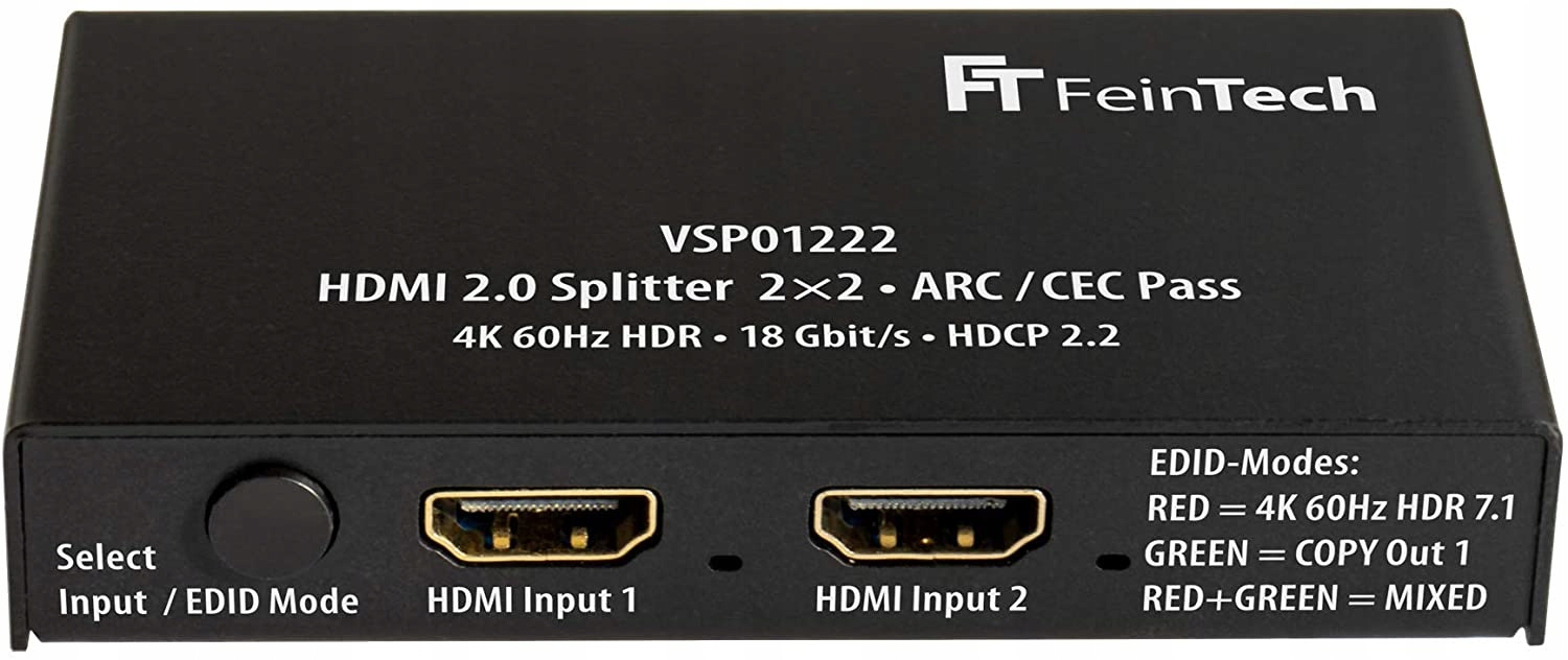 FeinTech VSP01222 Разветвитель HDMI 2.0 2 входа 2 выхода ARC Pass скалер для AV-ресивера 4K 60 Гц HDR