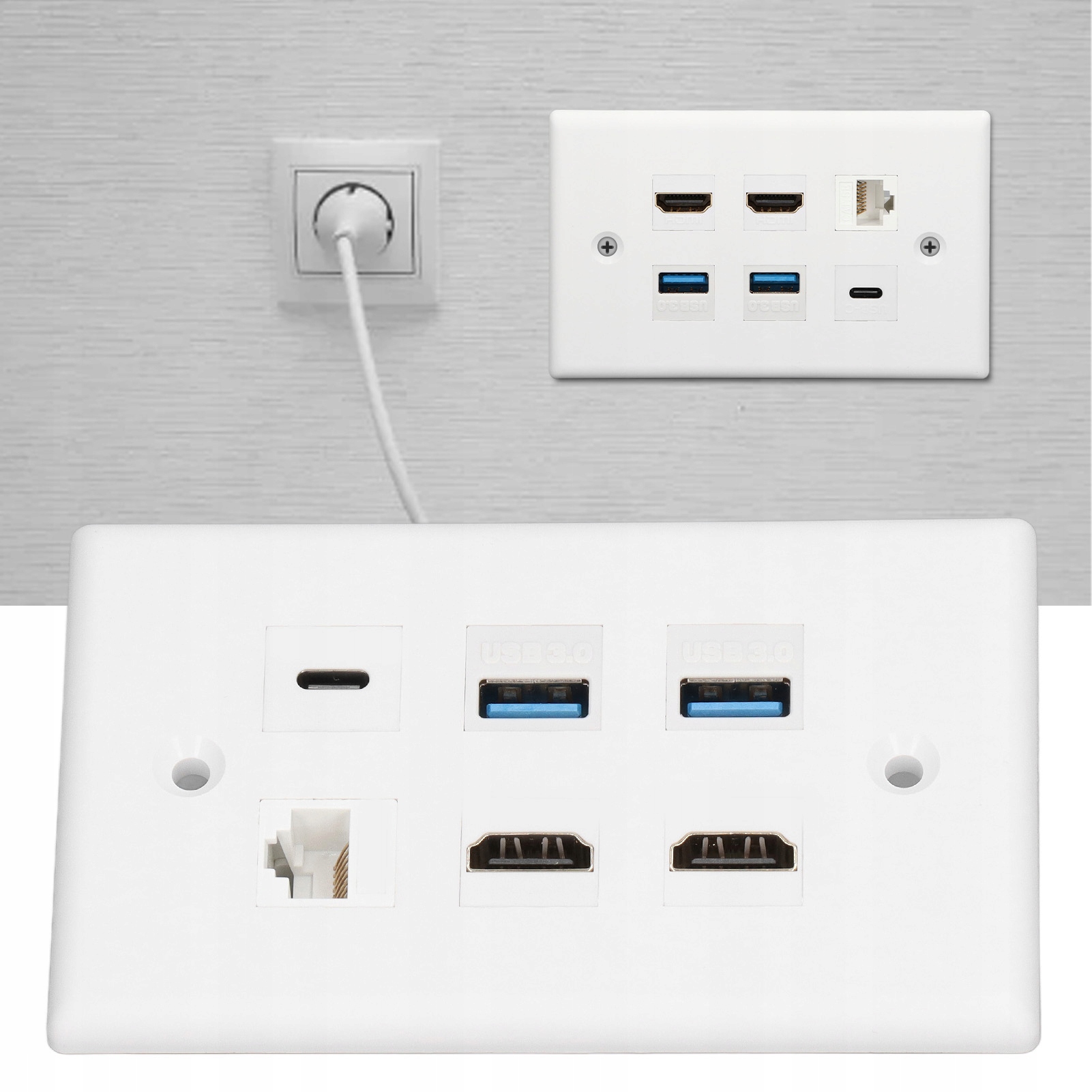 2. 6 портов: эта настенная панель с 6 портами обеспечивает 2 мультимедийных интерфейса HD: 1 Cat 6, 2 USB3.0, 1 USB C.