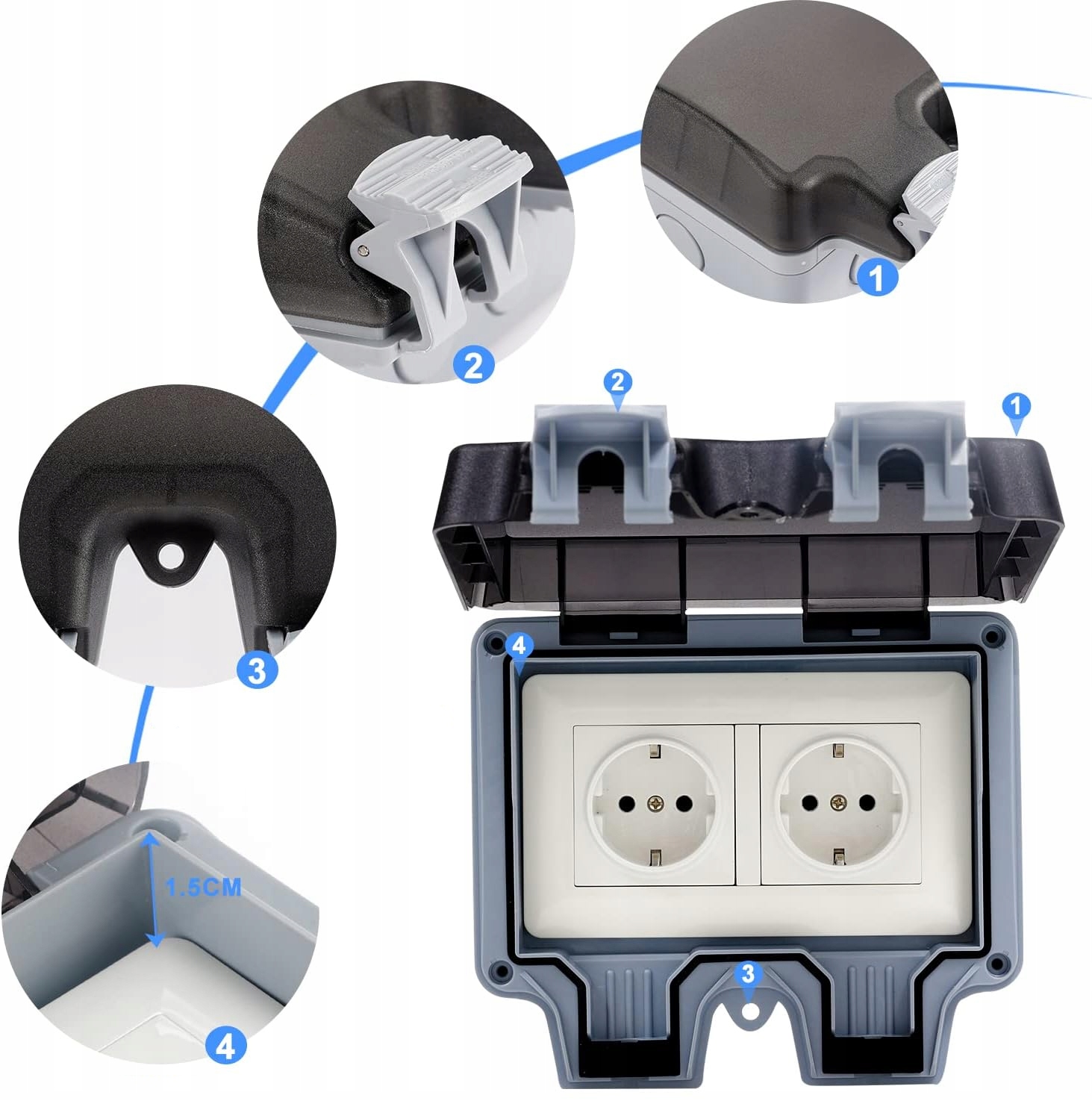 ⏩Атмосферостойкий пластик. Внешняя розетка устойчива к любым погодным условиям и обеспечивает длительный срок службы. Крышка защищает розетки от погодных условий. Крышка фиксируется застежками, предотвращающими попадание воды и пыли. Чтобы защитить детей от опасности, всегда закрывайте крышку независимо от того, включено или выключено питание.