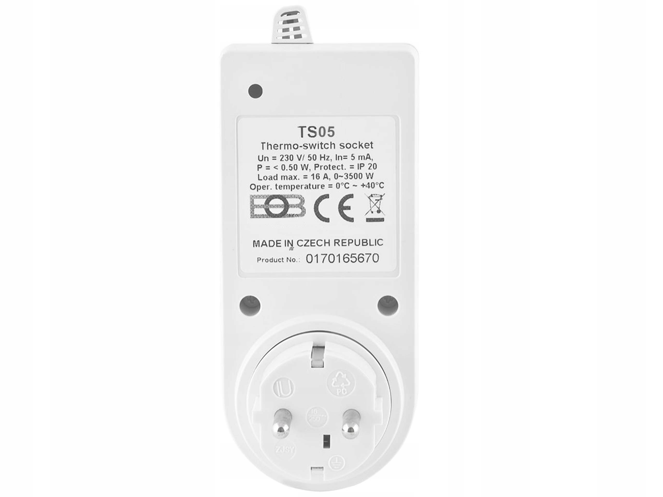 ТЕРМОСТАТ ELEKTROBOCK TS05 — простой регулятор температуры розеточного типа без недельного программатора для электронагревательных приборов. Имеет встроенный датчик температуры воздуха. Используется для инфракрасных нагревательных панелей и других электронагревателей. Термостат прост в установке. Просто подключите термостат к розетке и вставьте вилку обогревателя.