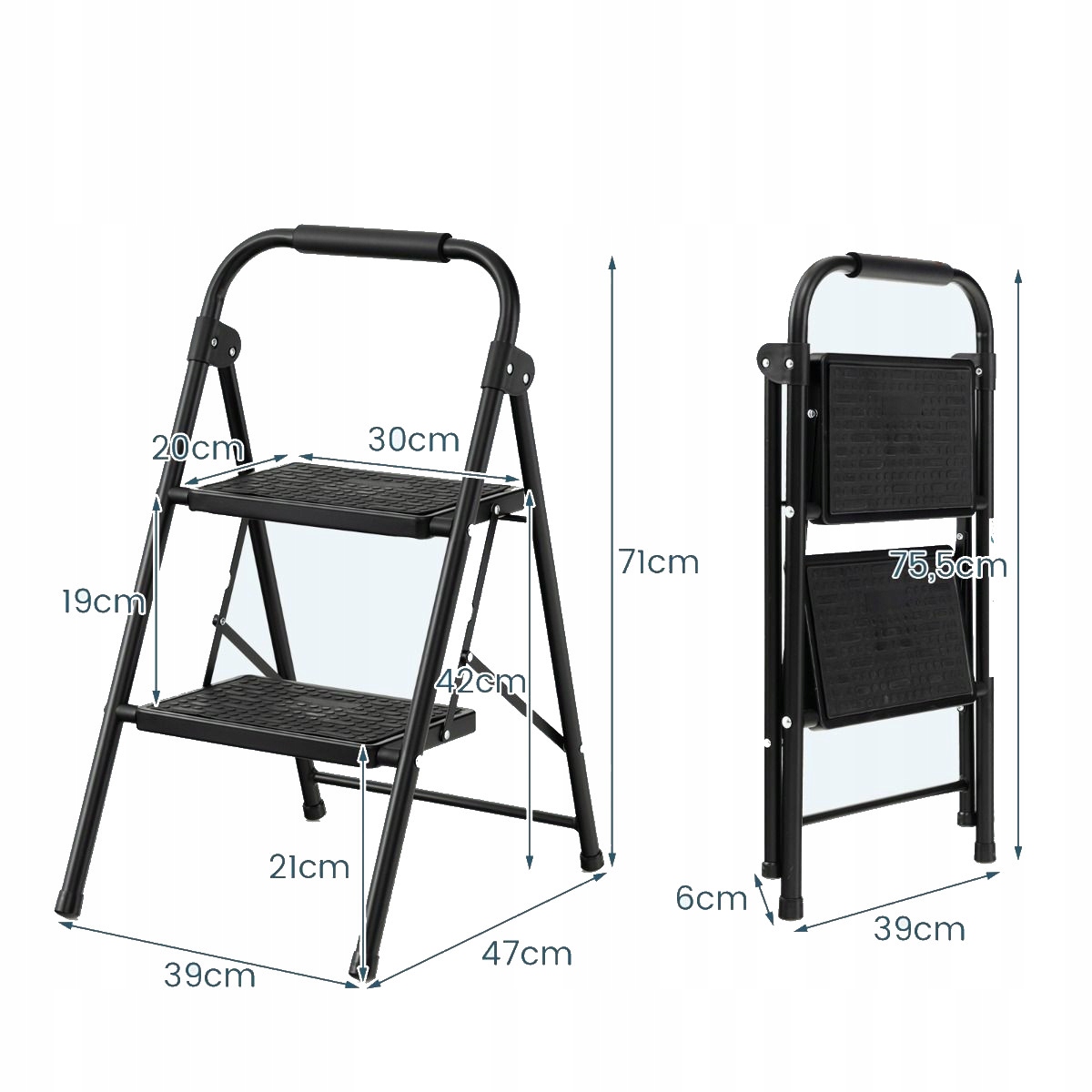 Двухступенчатая складная лестница с исключительно широкими ступенями и нескользящей поверхностью. Он оснащен удобной мягкой ручкой, обеспечивающей надежную поддержку и исключающей риск случайного падения. Изготовлен из прочного металла, выдерживает нагрузку до 265 кг. Под верхней ступенькой вы найдете предохранительный замок, который позволяет легко зафиксировать лестницу и обеспечить ее устойчивость во время использования. Благодаря складной конструкции лестницу легко хранить, когда она не используется. Эта легкая и портативная лестница станет идеальным дополнением к вашей кухне, гостиной или офису и облегчит повседневную работу по дому.