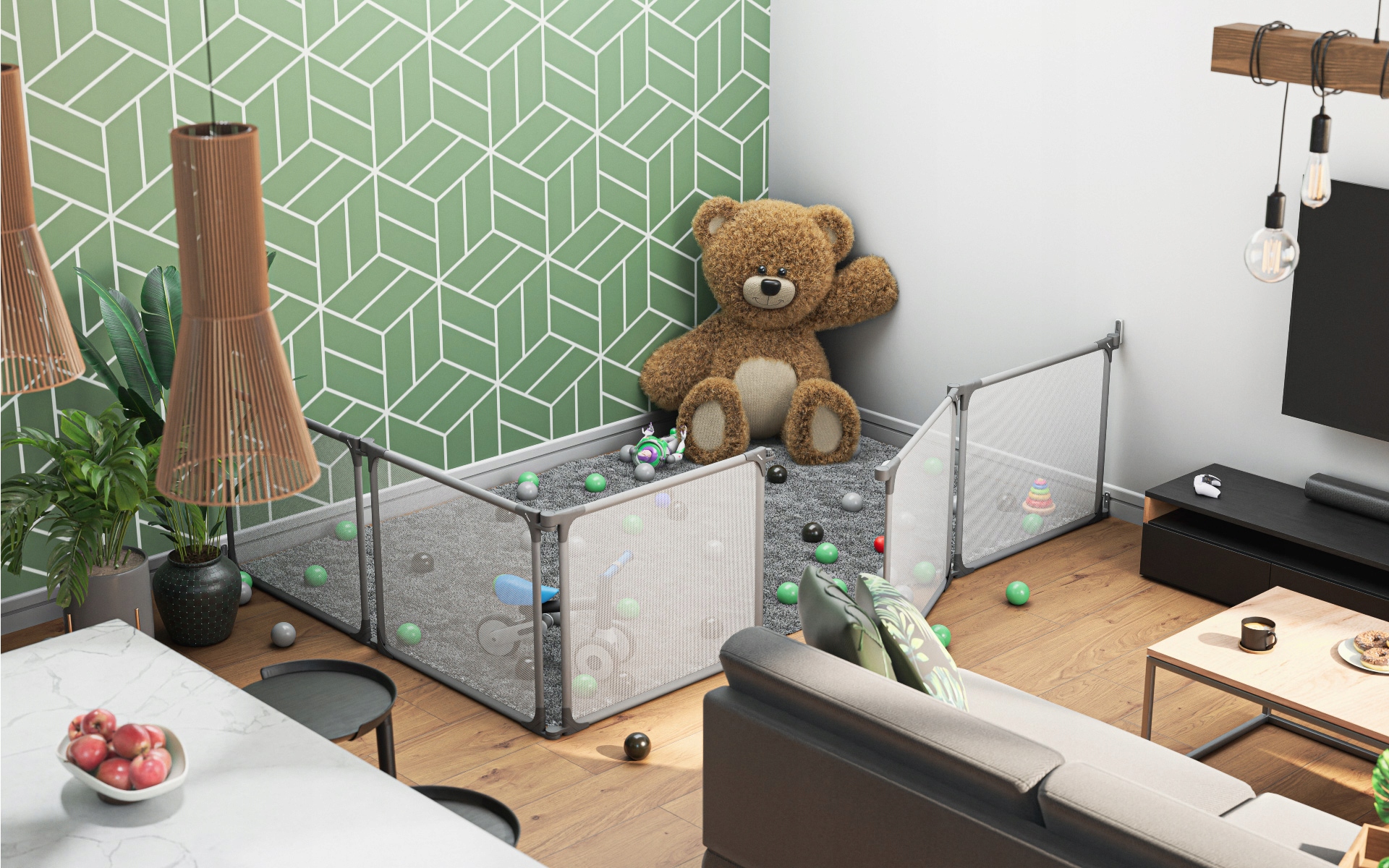 Благодаря нескользящим ножкам манеж можно разместить как на ковре, так и на панелях или плитке внутри дома. Современный и эстетичный дизайн идеально вписывается в большинство интерьеров.