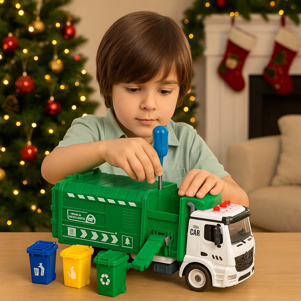➡️ Большой мусоровоз Jumbo 32 см с ручным подъемом корзин, подсветкой и звуками дает детям реалистичные действия, которые учат экологии и ответственности.