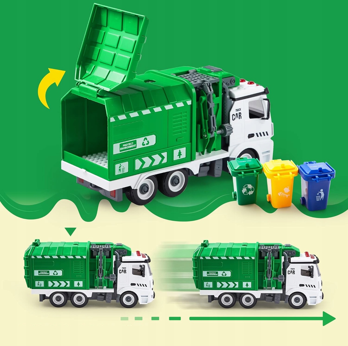 ➡️ Подъем корзин, опрокидывание мусора внутрь, открывание задней части, фрикционный привод «нажми и работай» без батареек, а также световые и звуковые эффекты - все как в настоящем мусоровозе.