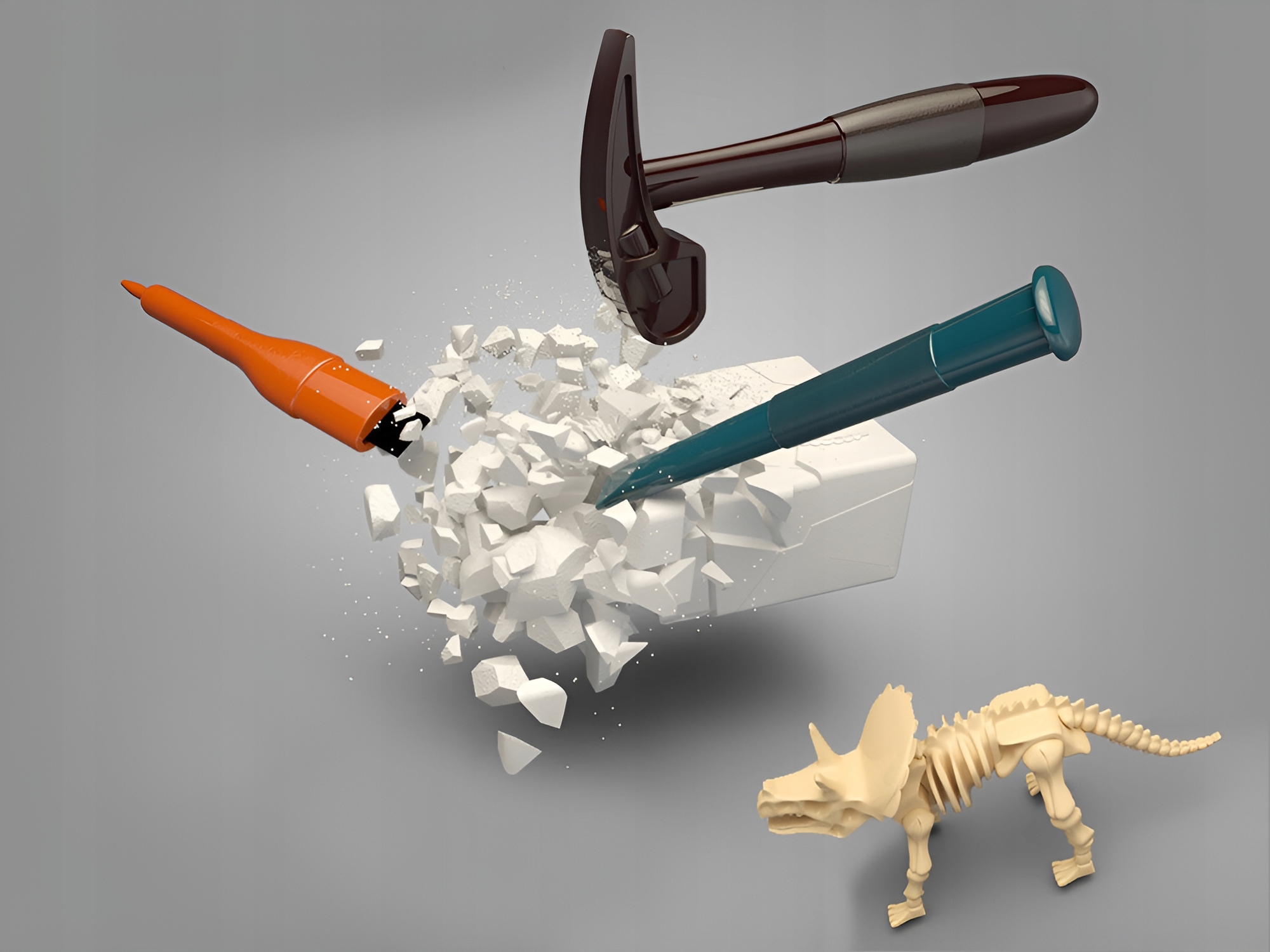 Позвольте своему ребенку использовать инструменты для копания, чтобы постукивать, чистить щеткой, чистить и собирать выкопанные скелеты динозавров.