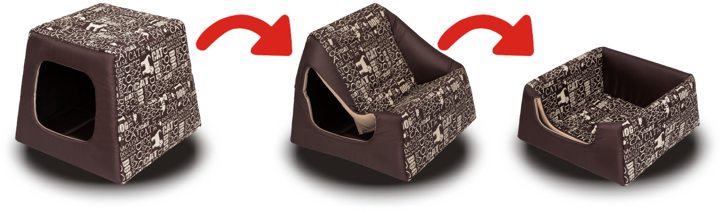 Преобразование конуры в берлогу – очень простая операция. Просто нажмите на крышу внутрь, как показано на рисунке ниже. Чтобы превратить кровать обратно в конуру, просто поднимите крышу.