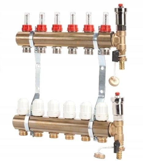 Распределитель для теплого пола - 10 контуров. Коллектор теплого пола оснащен ротаметрами, термостатическими клапанами, воздухоотводчиками и сливными кранами. Он изготовлен из высококачественной латуни. Использование ручек гарантирует устойчивость установки и точность сборки коллектора. Верхняя балка оснащена ротаметрами, позволяющими точно регулировать потоки в контурах отопления. Диапазон регулировки ротаметра: 0,5-5 литров жидкости в минуту.
