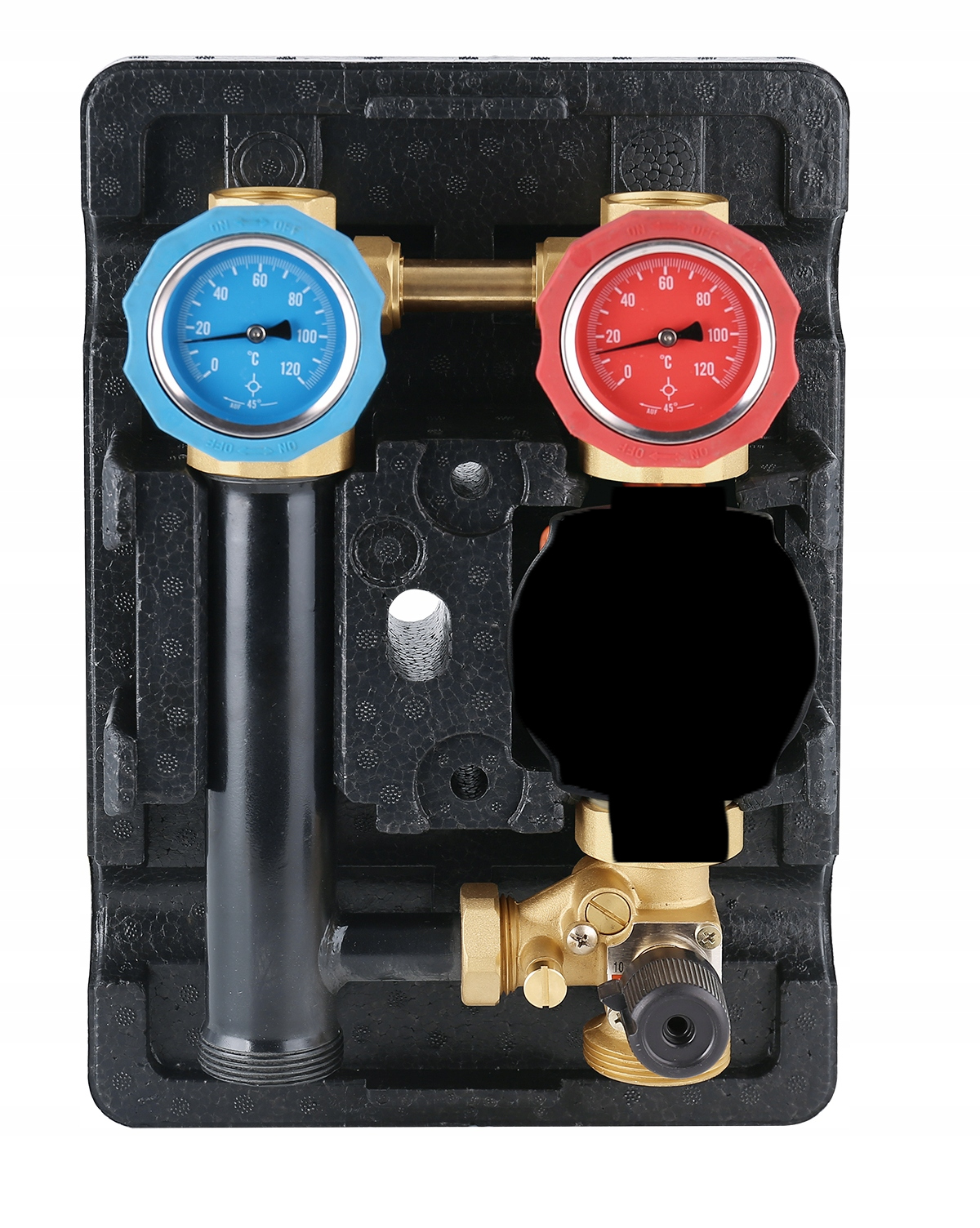 - Вверху шаровые краны диаметром 1 дюйм со встроенными термометрами и обратными клапанами.