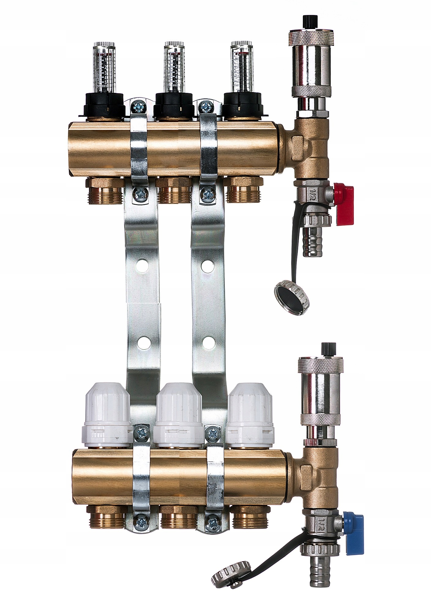 Диверторы направляют теплоноситель в отдельные контуры теплого пола. В нашем предложении есть комплекты, предназначенные как для теплого пола, так и для установки с радиаторами - с балками из изготовлены из латуни или нержавеющей стали. Необходимым оборудованием коллектора теплого пола являются расходомеры, которые используются для выполнения гидравлической балансировки установки, т.е. выравнивания потоков на отдельных контурах. Ротаметры высочайшего качества, используемые в коллекторах, позволяют считывать расход, регулировать его и полностью замыкать заданный контур. Еще одним элементом коллектора, необходимым для поверхностного отопления, являются термостатические клапаны на обратной балке – с ручками для ручного управления и возможностью установки термоэлектрической головки со стандартным соединением М30х1,5 для использования электронной системы управления отоплением.