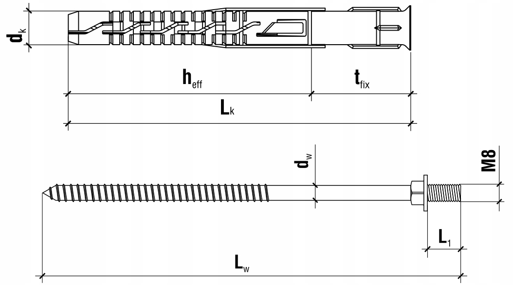 Состоит из втулки из полиамида и винта из оцинкованной стали с метрической резьбой М8.