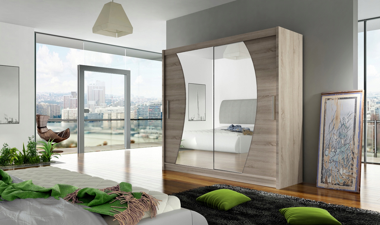 Двухдверный шкаф с системой раздвижных дверей и зеркалами, облегчающий повседневное использование. Современный, функциональный и элегантный. Предназначен для безопасного хранения одежды и других личных вещей.