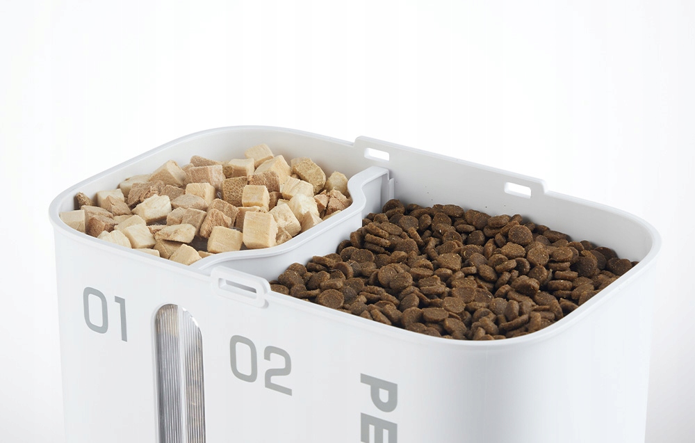 Позаботьтесь о здоровом питании вашего питомца. Он оснащен 2 камерами, а прозрачный индикатор сообщит вам о количестве еды в резервуаре. Благодаря современным решениям он сохраняет продукты свежими и не допускает их застревания в резервуаре.
