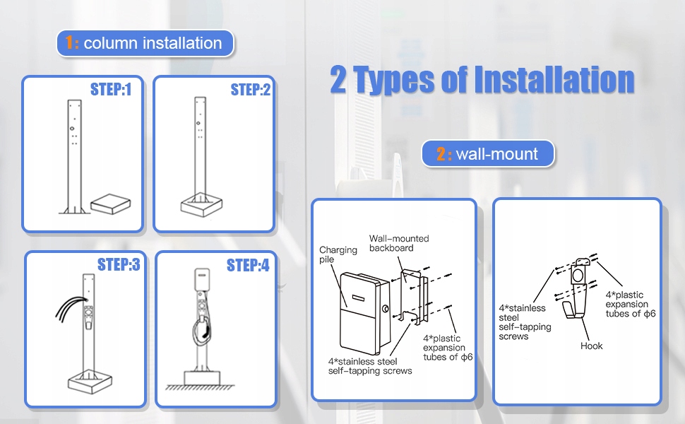 *2 Простые способы установки: первый вариант — установка на стену с помощью прилагаемых бесплатных аксессуаров. Второй — сделать столб с бетонным основанием и установить на него столб для зарядки электромобилей. Его можно легко установить, следуя инструкциям. "
