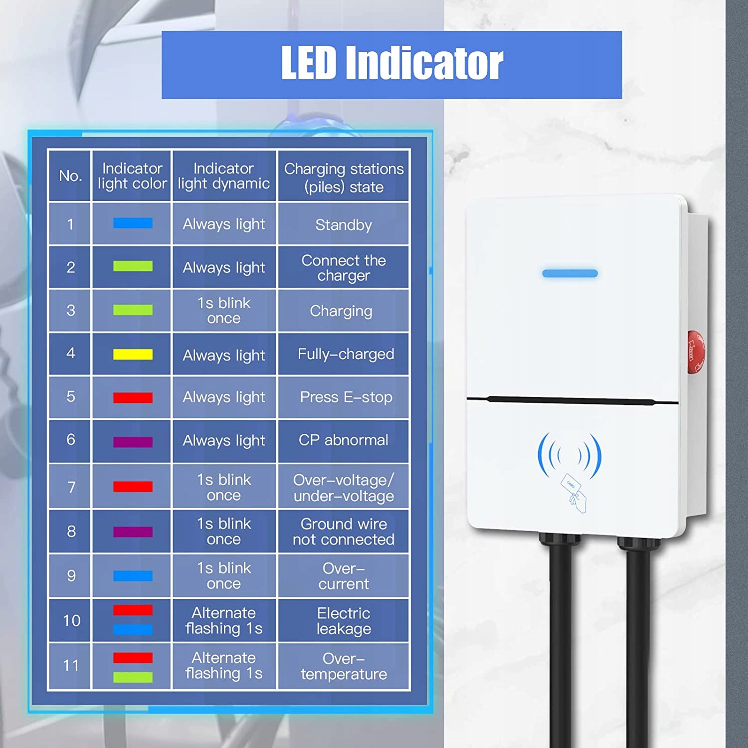 * Светодиодный индикатор, указывающий состояние зарядки: Светодиодный индикатор на станции электромобиля позволяет нам интуитивно понимать текущий статус зарядки, а автомобильное зарядное устройство автоматически выключается, когда автомобиль полностью заряжен, что помогает защитить автомобиль и экономить электроэнергию.