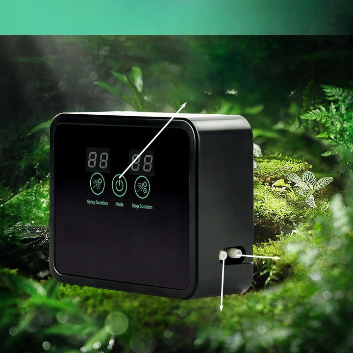 Устройство оснащено тремя интуитивно понятными кнопками, которые позволяют устанавливать время работы, частоту и задержку увлажнения. Благодаря этому можно точно настроить условия под нужды животных.
