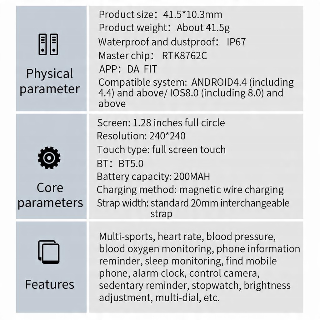 Цветной дисплей 1,28 дюйма, батарея 200 мАч; Мониторинг весь день и здравоохранение