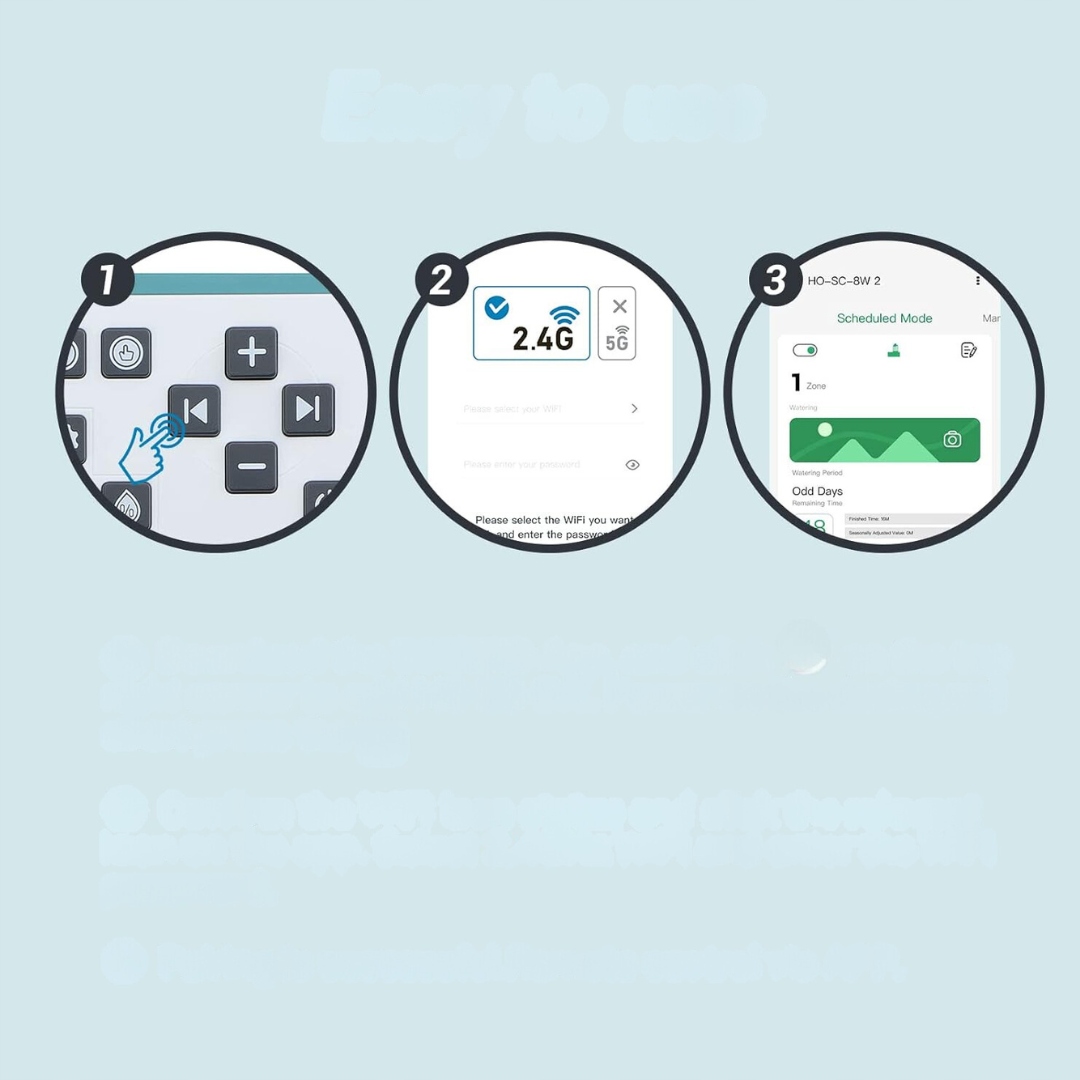 Интеллектуальный контроллер управления ирригацией в максимуме в шести зонах обеспечивает автоматические и ручные режимы работы. График орошения, включая сезонные изменения и циклические условия, которые способствуют эффективному управлению водой в саду