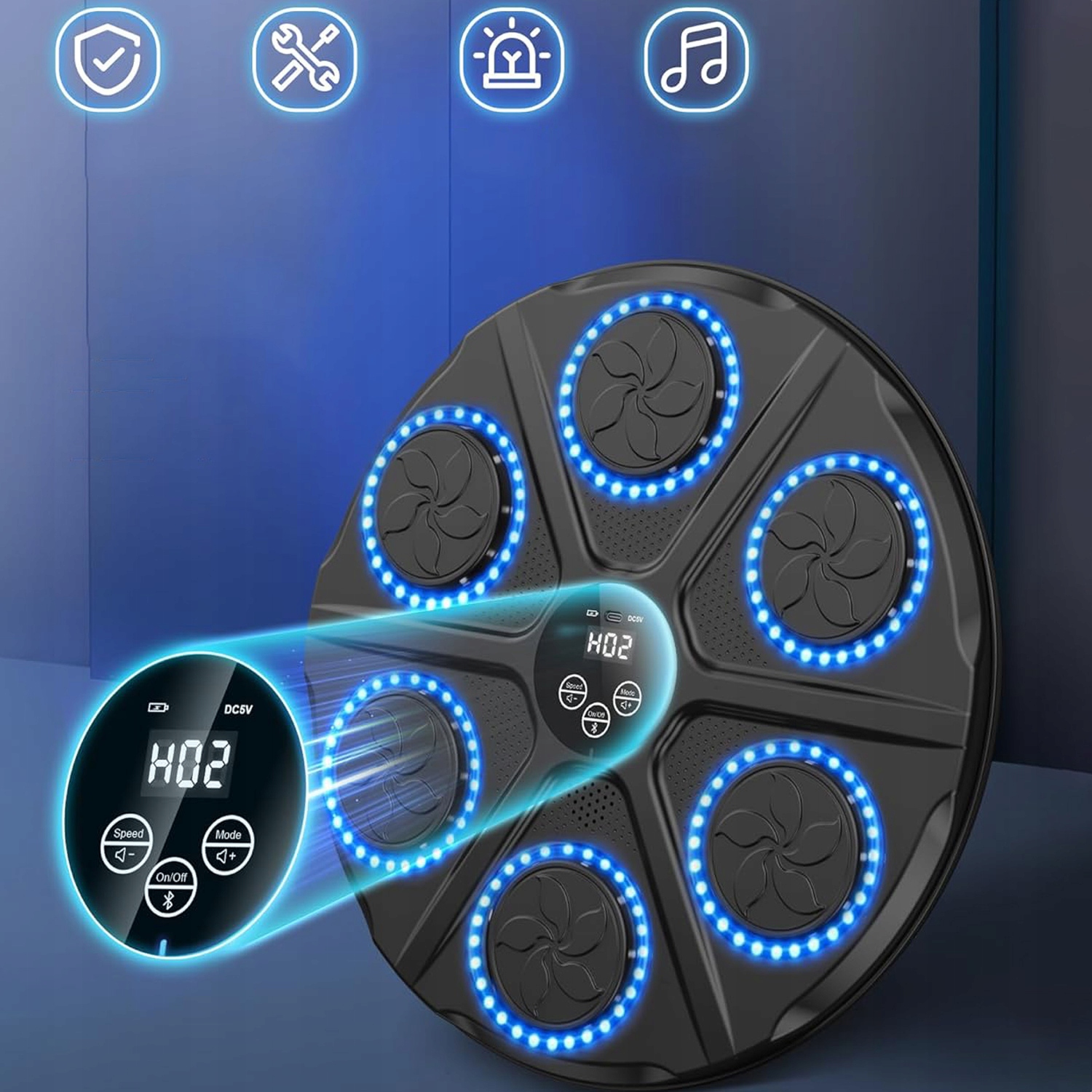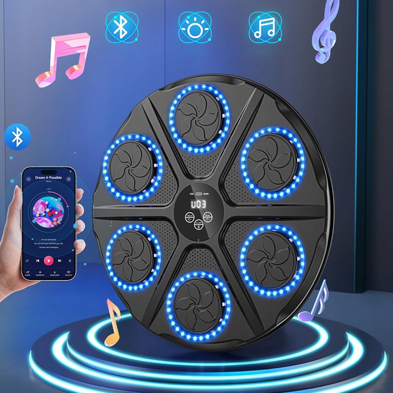 Светодиодный дисплей показывает количество нажатий и отслеживает ваш прогресс. Этот умный музыкальный боксерский тренажер для взрослых поддерживает Bluetooth, что позволяет вам слушать любимые песни во время занятий боксом. Динамики и эффектное освещение помогут вам сосредоточиться во время тренировки. Это идеальное устройство для профессиональных тренировок и ежедневных упражнений, подходящее для профессиональных боксеров, любителей фитнеса, взрослых, детей и многих других.