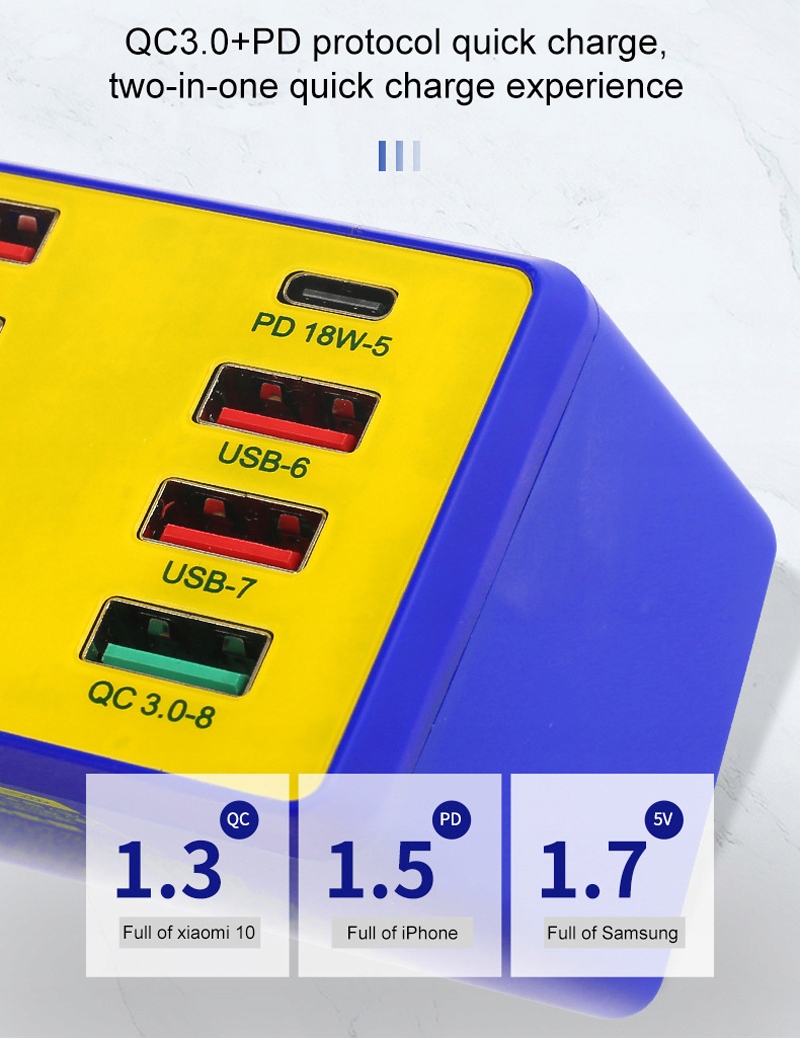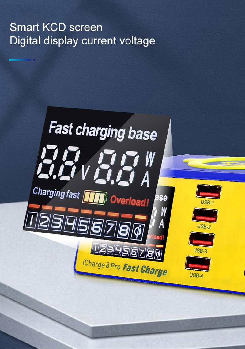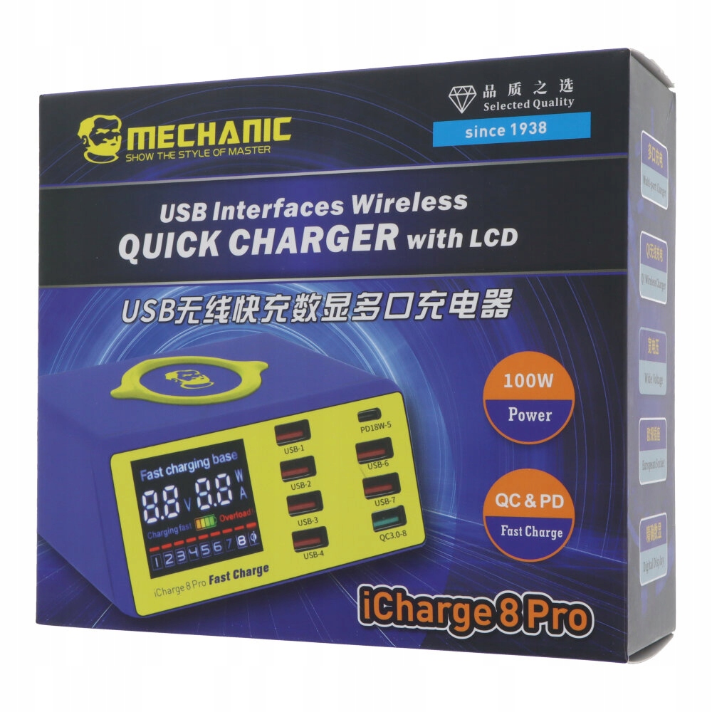 Зарядное устройство Mechanic iCharge 8 Pro представляет собой восьмипортовую зарядную станцию с технологией быстрой зарядки QC 3.0 и беспроводной зарядкой, оснащенную ЖК-дисплеем. Его отличает высокая мощность в 100 Вт, что обеспечивает стабильный ток и безопасную зарядку без перегрева. Устройство оснащено интеллектуальными функциями, такими как «режим капельного орошения», который предотвращает перезарядку и продлевает срок службы батареи.