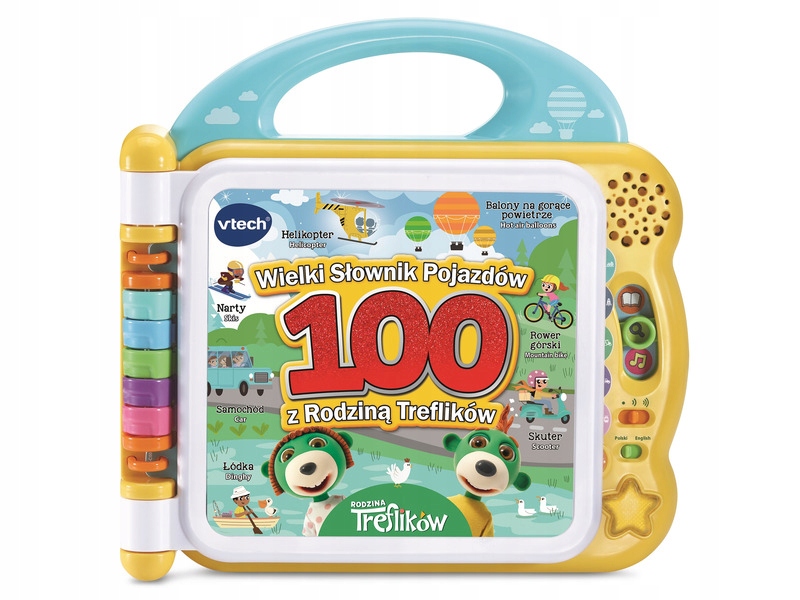 Большой словарь транспортных средств — интерактивная книга с двумя языковыми версиями — польской и английской (переключатель расположен на правой панели словаря). Игрушка состоит из желтой основы с динамиком и синей ручки для переноски словаря. Имеет пластиковую обложку и картонные страницы с рисунками и надписями на обоих языках. Игрушка имеет переключатель включения/выключения с регулировкой громкости.