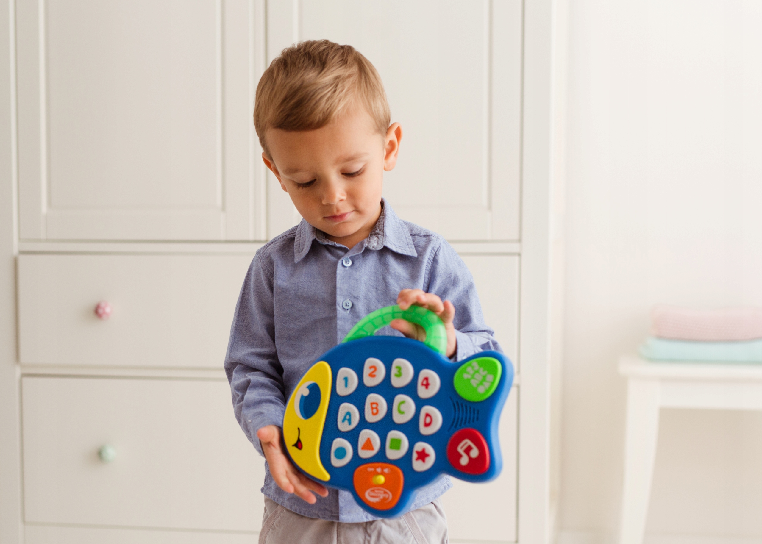 Практическая ручка облегчит переноску игрушки, а переключатель позволит отрегулировать громкость звука в соответствии с потребностями ребенка или полностью отключить ловить рыбу после окончания игры.