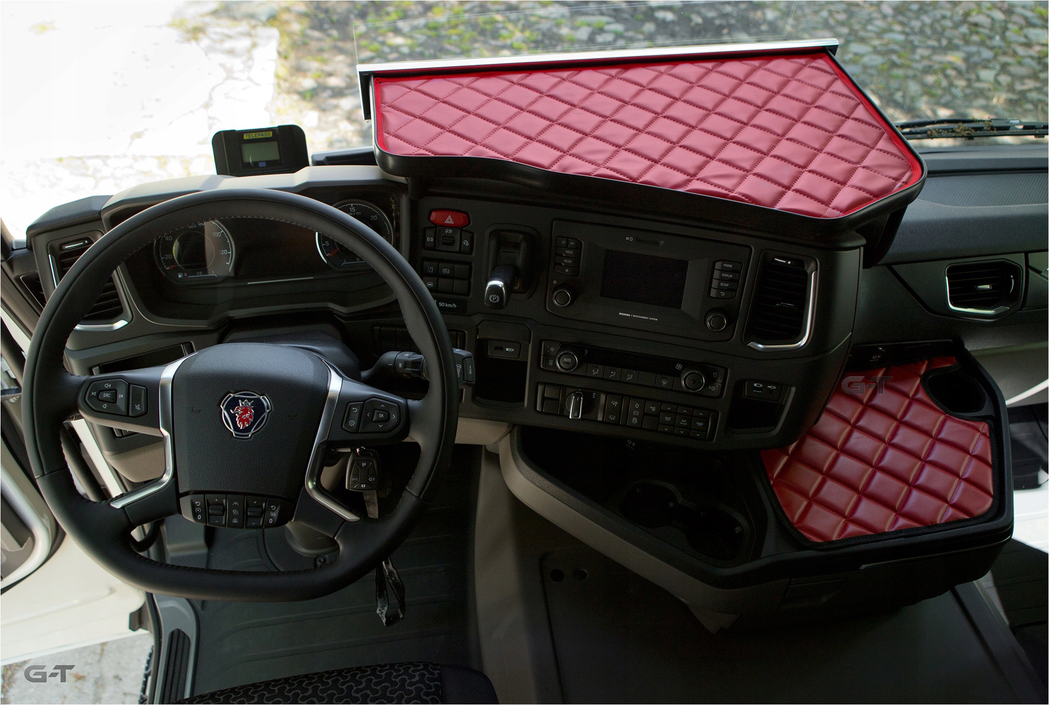 предметом аукциона является средняя полка для НОВЕЙШЕЙ модели Scania "S" и для новой модели "R" 2016 года выпуска, облицованная стеганным ковриком, с фрезерованными ножками и никелированной надписью.