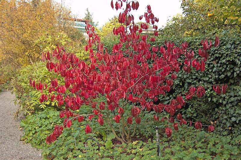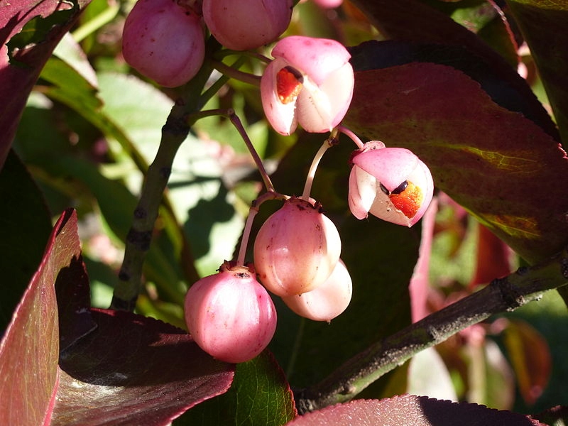 Редкий сорт бересклета, который можно встретить в ботанических садах и дендрариях. Это один из самых красивых кустарников, меняющих окраску осенью. Родом из Китая, частично вечнозеленый – в мягкую зиму листья долго держатся на растении и очень декоративны. Весной они крупные, темно-зеленые, блестящие, направлены вниз, осенью становятся пурпурно-бордовыми. Цветет на рубеже мая и июня, цветки мелкие, четырехлепестковые, кремово-белые. Плоды очень декоративные, шаровидные, розовые, при раскрытии обнаруживают мелкие черные семена с оранжевыми зернышками. Зонтиковидный, кустистый, вырастает до 2-2,5 м в высоту и 3 м в ширину. Побеги живописно свисают. Веретеница крупноцветковая красивее всего смотрится при посадке одиночно или небольшими группами.