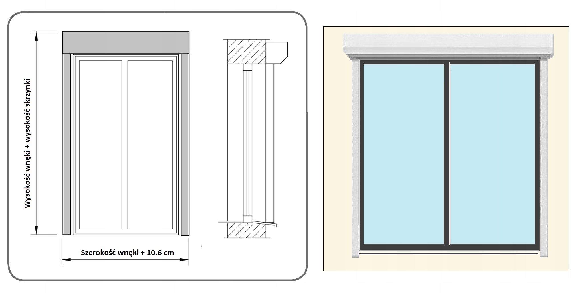 Ширина Blinds = мы измеряем ширину углубления + добавить 2 x ширины гидов (одно направляющее составляет 5,3 мм, поэтому к ширине углубления должна быть добавлена около 10,6 см)