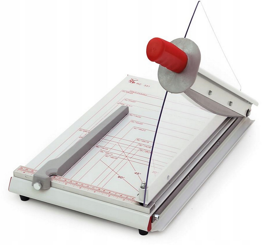 Современная офисная гильотина с ручной системой прижима бумаги.