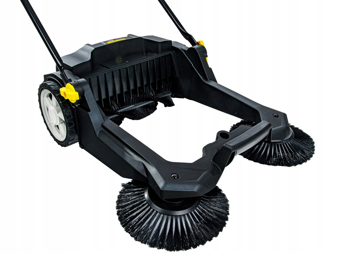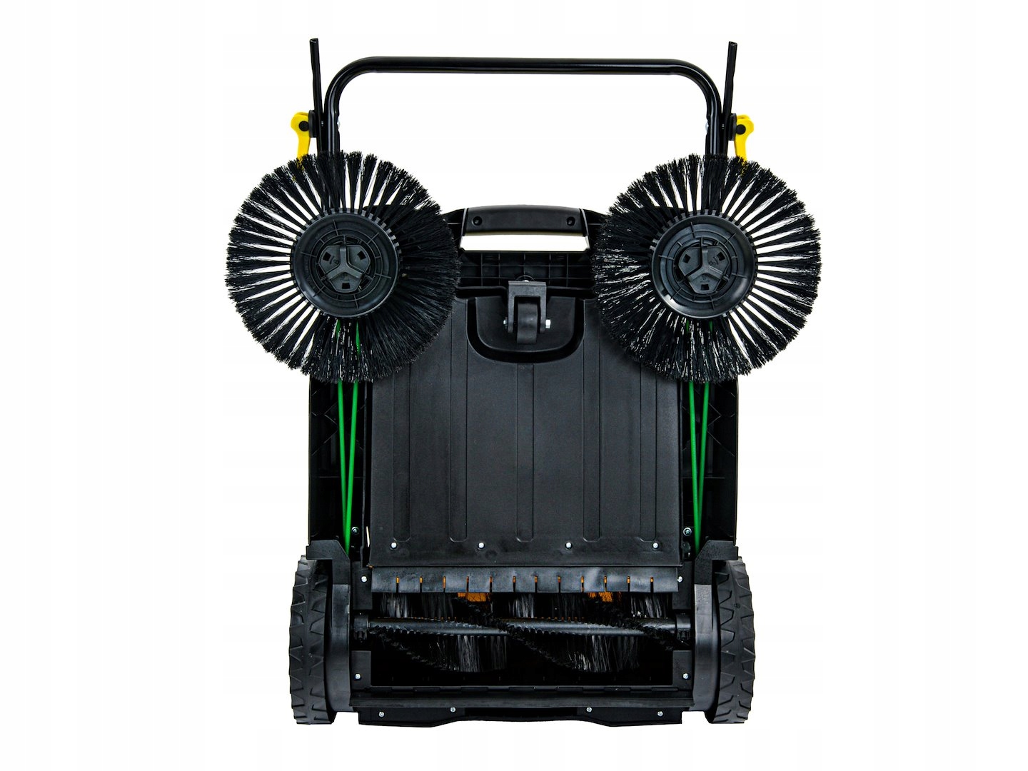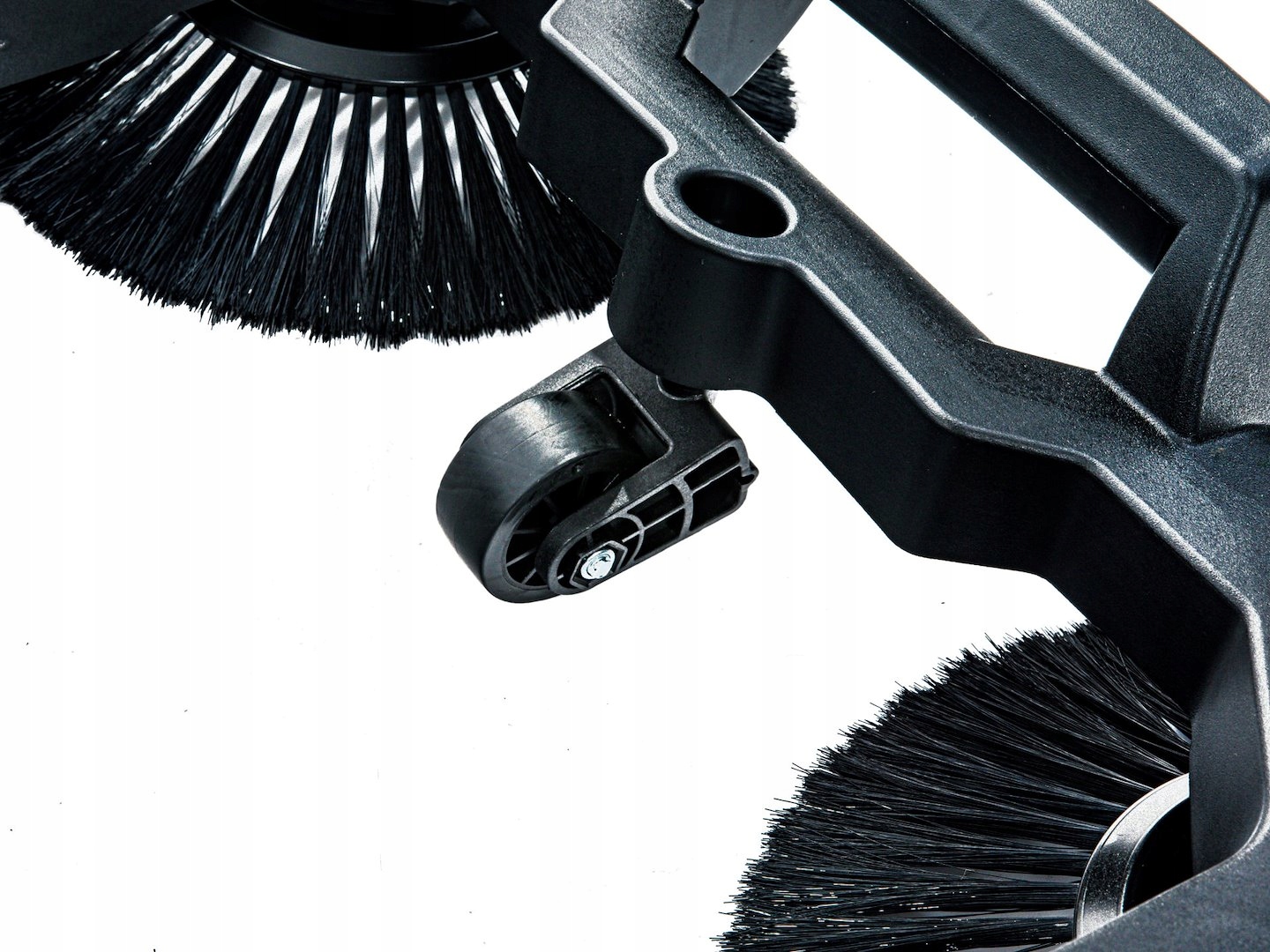 Подметальная машина оснащена двумя передними чистящими колесами и дополнительной чистящей рукояткой сзади, которые взаимодействуют благодаря системе, приводимой в движение гибким резиновым ремнем. Этот механизм означает, что при нажатии на устройство все щетки вращаются плавно и с большой мощностью, эффективно собирая пыль, песок, листья и другую мелкую грязь.