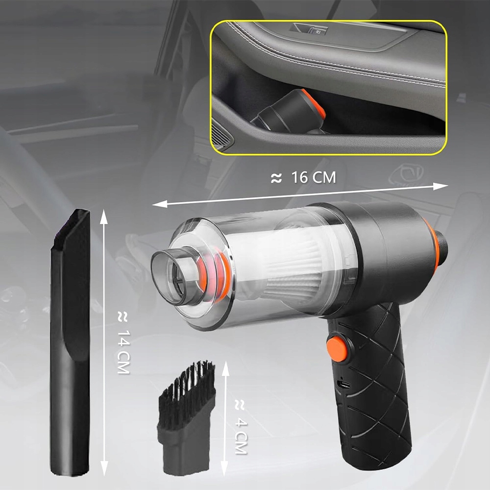 Двухфункциональный пылесос с выдувом и всасыванием, оснащенный длинной всасывающей насадкой, насадкой для выдувания и щеткой для пыли, подходит для различных сцен, может добраться до каждого угла в ваш автомобиль или дом, легко справляется с трудно поддающимися уборке местами.