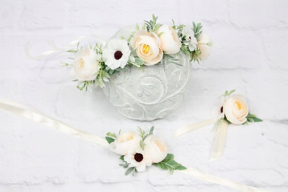 В комплект также входят венок на голову и булавка для бутоньерки.