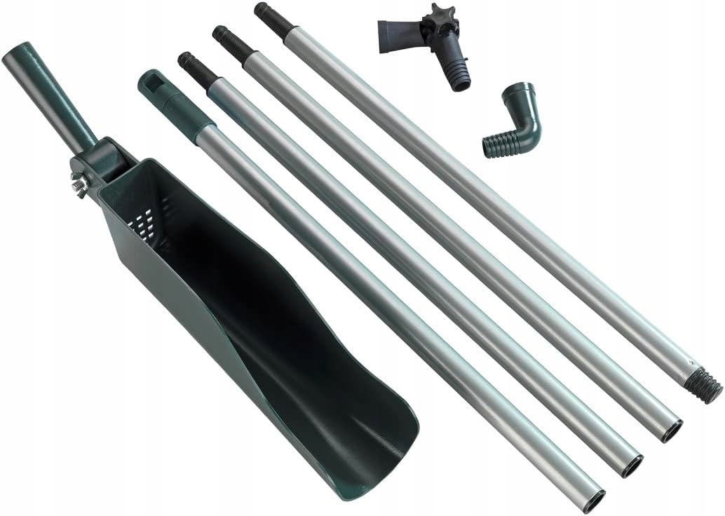 С телескопическим удлинителем: благодаря телескопическому удлинителю (очень длинная телескопическая ручка обеспечивает вылет до 4,5 м) и регулируемому шарниру в 3-х осях полотно желоба можно направлять с разных направлений - сверху через окно или с пола над головой