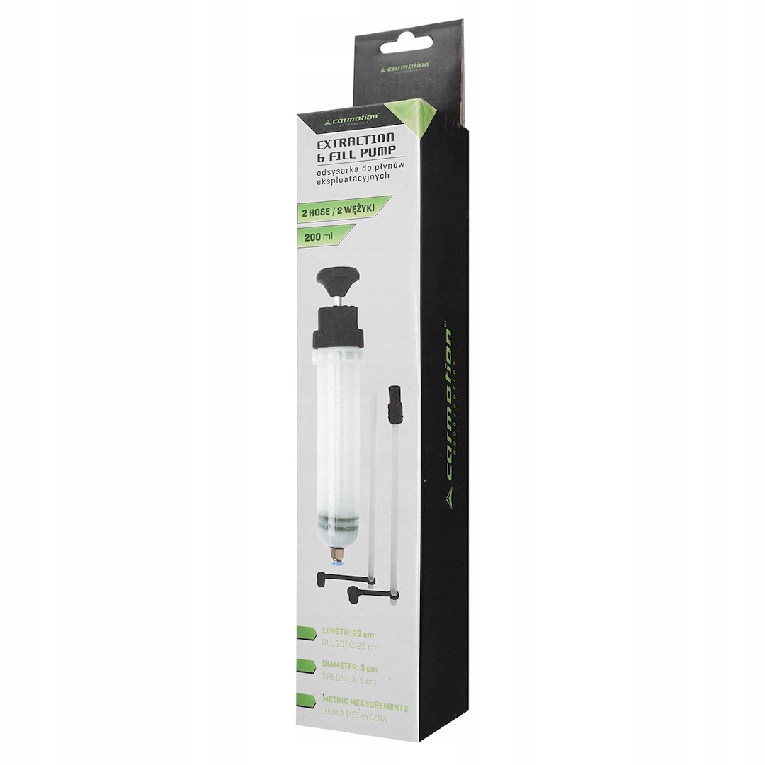 Шприц имеет прозрачный резервуар. В комплект входит подпружиненная съемная трубка с гайкой. Идеально подходит, в частности, для использования с тормозной жидкостью, охлаждающей жидкостью, жидкостью гидроусилителя рулевого управления или различными типами масел.